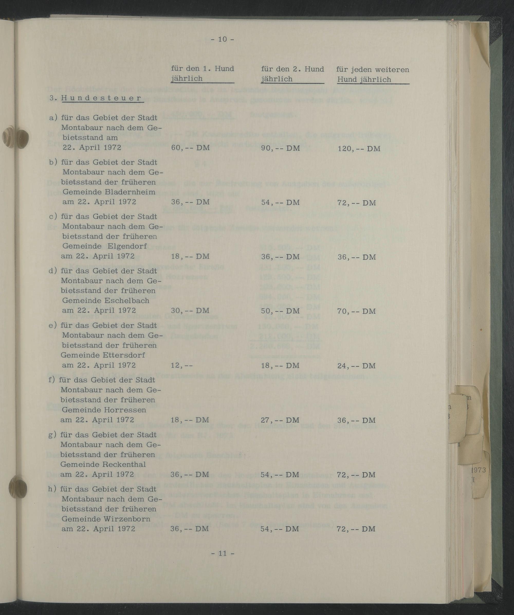 d) für das Gebiet der Stadt Montabaur nach dem Gebietsstand der früheren Gemeinde Eschelbach am 22. April 1972 30,— DM