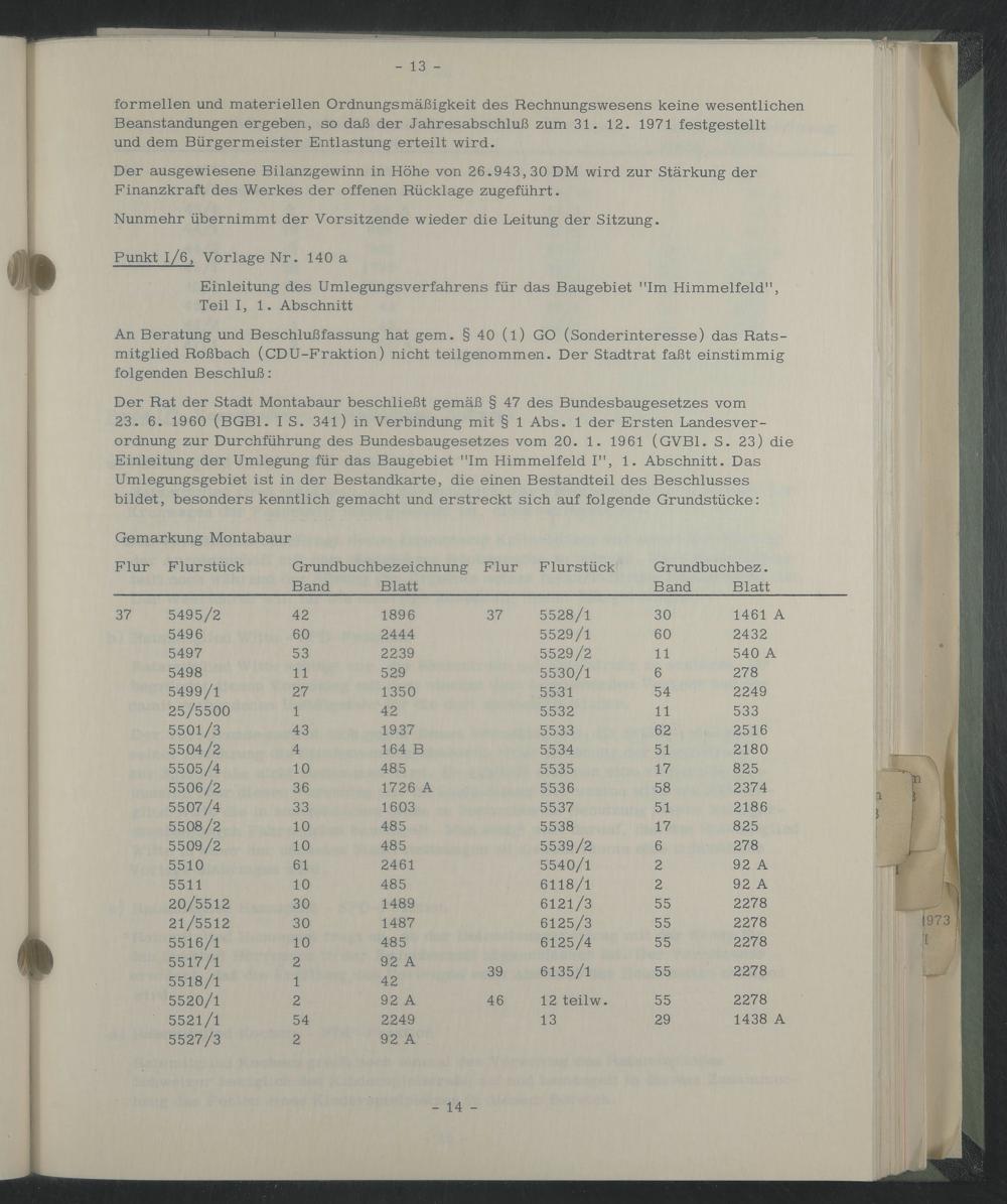 Der Rat der Stadt Montabaur beschließt gemäß § 47 des Bundesbaugesetzes vom 23. 6. 1960 (BGBl. IS. 341) in Verbindung mit § 1 Abs. 1 der Ersten Landesverordnung zur Durchführung des Bundesbaugesetzes vom 20. 1. 1961 (GVB1. S. 23) die Einleitung der Umlegung für das Baugebiet "Im Himmelfeld I", 1. Abschnitt. Das Umlegungsgebiet ist in der Bestandkarte, die einen Bestandteil des Beschlusses bildet, besonders kenntlich gemacht und erstreckt sich auf folgende Grundstücke: