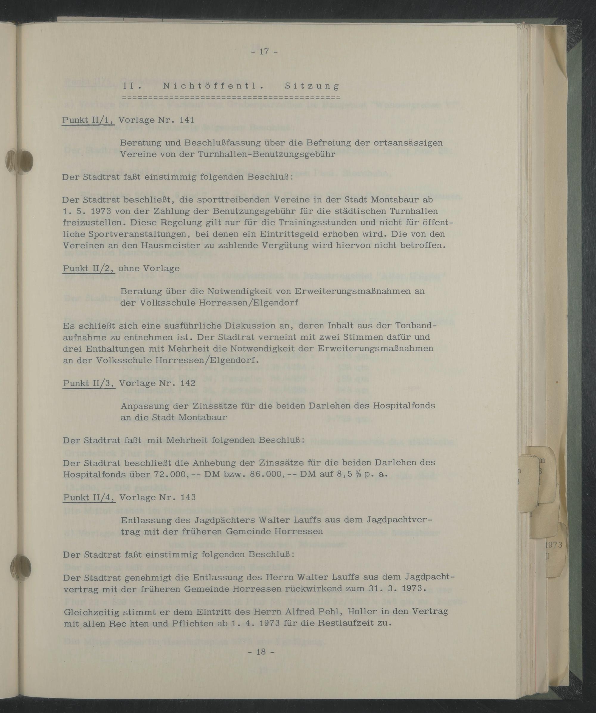 Der Stadtrat genehmigt die Entlassung des Herrn Walter Lauffs aus dem Jagdpachtvertrag mit der früheren Gemeinde Horressen rückwirkend zum 31. 3. 1973.