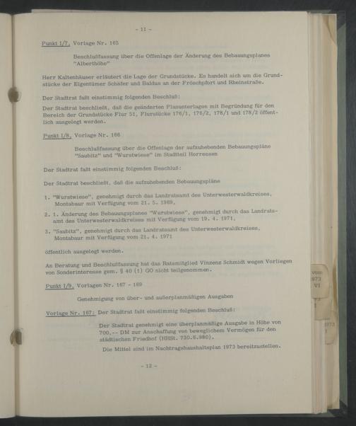 An Beratung und Beschlußfassung hat das Ratsmitglied Vinzenz Schmidt wegen Vorliegen von Sonderinteresse gern. § 40 (l) GO nicht teilgenommen.