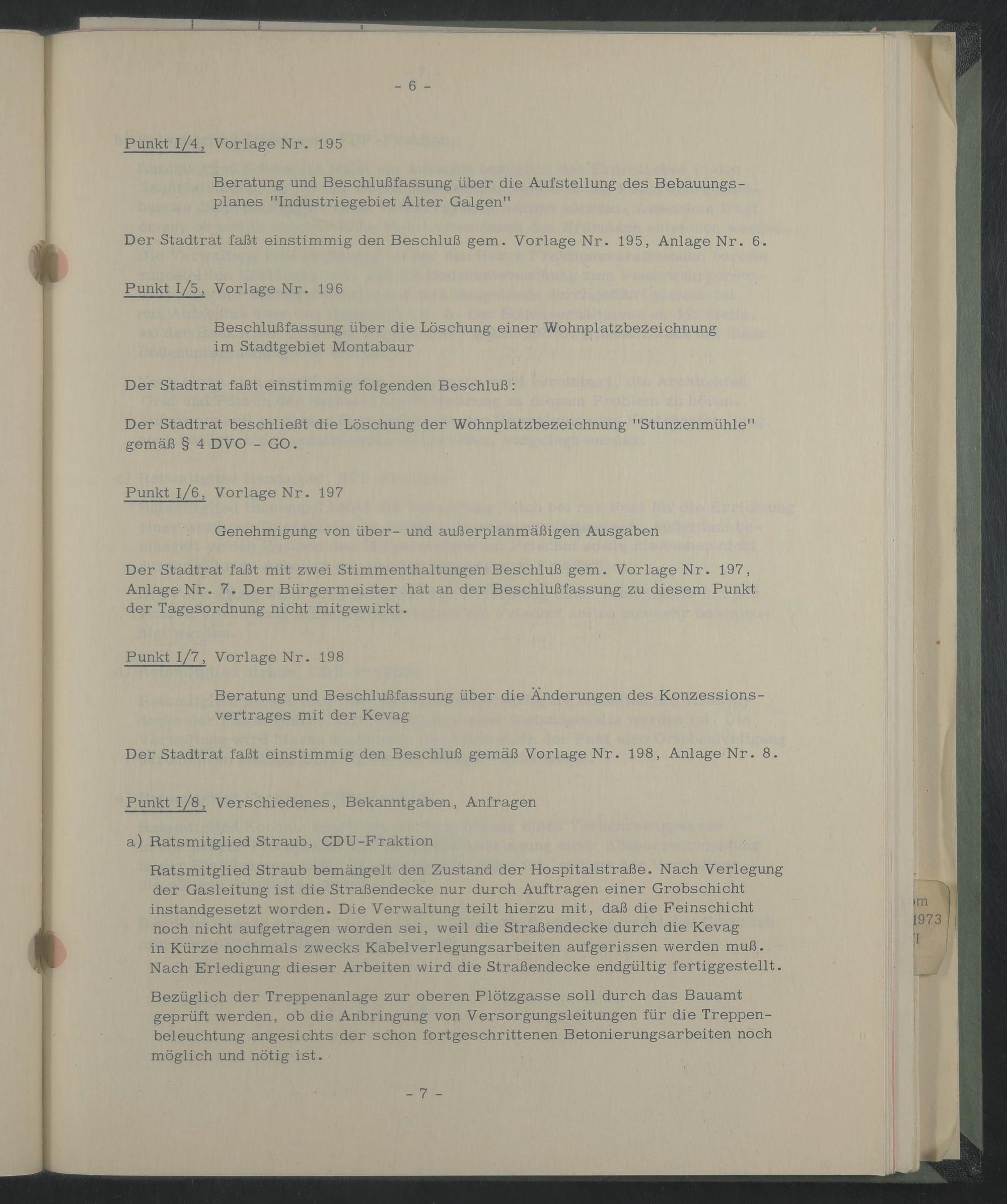 Der Stadtrat faßt einstimmig den Beschluß gern. Vorlage Nr. 195, Anlage Nr. 6.