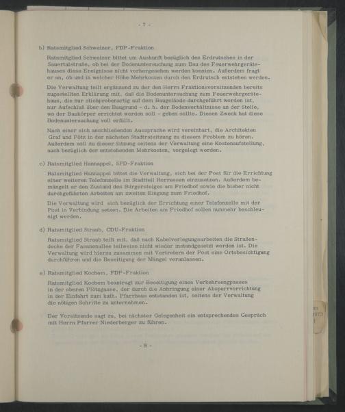 Ratsmitglied Hannappel bittet die Verwaltung, sich bei der Post für die Errichtung einer weiteren Telefonzelle im Stadtteil Horressen einzusetzen. Außerdem bemängelt er den Zustand des Bürgersteiges am Friedhof sowie die bisher nicht durchgeführten Arbeiten am zweiten Eingang zum Friedhof.