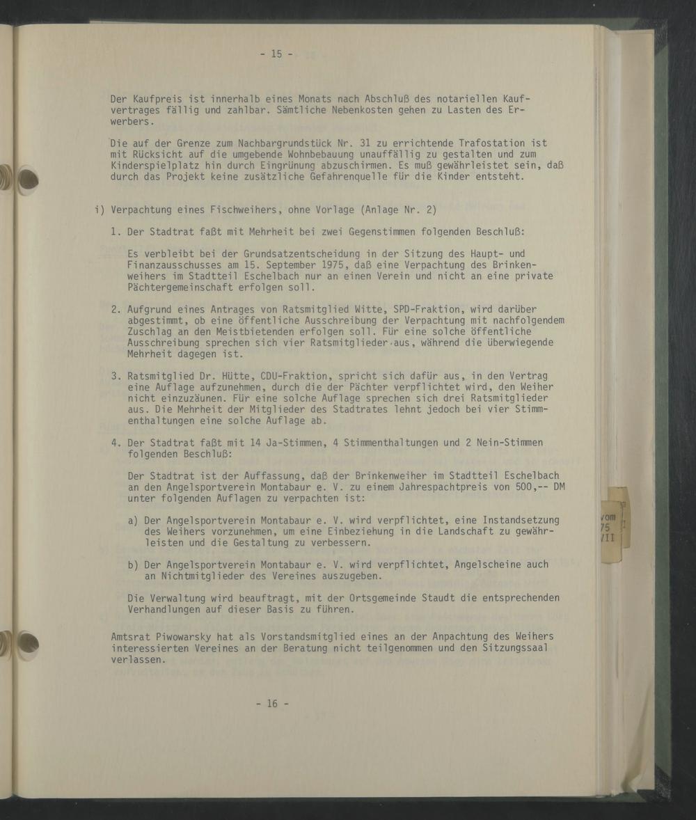 Der Stadtrat Ist der Auffassung, daß der Brlnkenwelher Im Stadtteil Eschelbach an den Angel Sportverein Montabaur e. V. zu einem Jahrespachtpreis von 500,-- DM unter folgenden Auflagen zu verpachten Ist: