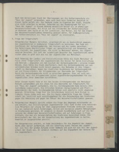 Sie sei lediglich durch Forderungen, Kritik und teilweise unwahre Behauptungen in Erscheinung getreten. Er verweist in diesem Zusammenhang auch auf die Besetzung des ehemaligen Hasserwirtschaftsamtes und auf Äußerungen in Flugblättern, die man als Verunglimpfung des Stadtrates bezeichnen könne. Die Bereitschaft der IGJ, bei der Ausgestaltung des Jugendzentrums zu helfen, bewertet er ausgesprochen positiv.
