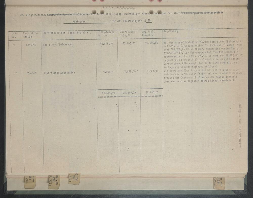 Bei. den Haushaltsstellen 615.950 (Bau einer Tiefgarage) und*615.990 (Gründungskosten'für Hochbauten) wdren ins",;- samt 165.769,29 OM verfügbar. Ausgegeben wurden lerrglir 159.593,07 DM. Oer Mehrausgabs bei 615.950 stehch tin- sparungen bei der HHSt. 615.990 in Höhe Von 76.823,06 i.M gegenüber. Es handelt sich hierbei also um eine Kosten- Verschiebung (die endgültige Aufteilung kann ers! nich Vorlage der SchluBabrechnung erfolgen). - Oie überplanmäßige Ausgabe ist bei der. HolzrlckJ.cstc- entstanden. Durch einen Fehicr bei der Haushaltssoliübnr- t'raqung der Deckungsmittel wurde der Haushaltsansatz über den noch verfügbaren Betrag hinaus vermindert.