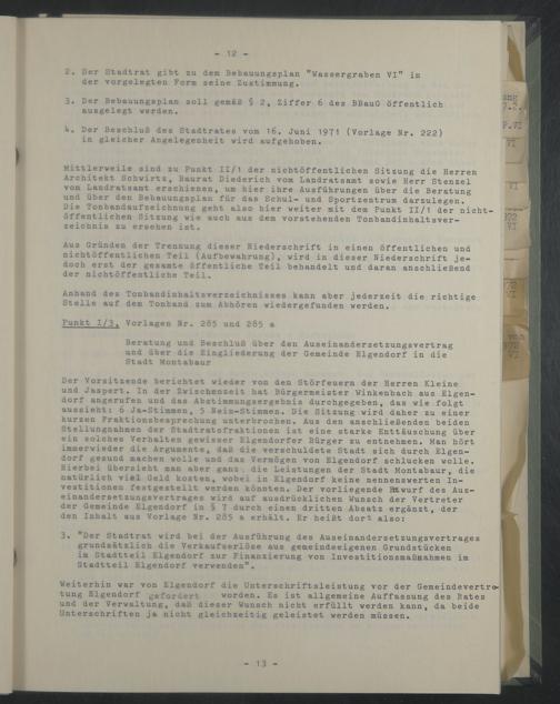Beratung und Beschluß über den Auseinandersetzungsvertrag und über die Eingliederung der Gemeinde Eigendorf in die Stadt Montabaur