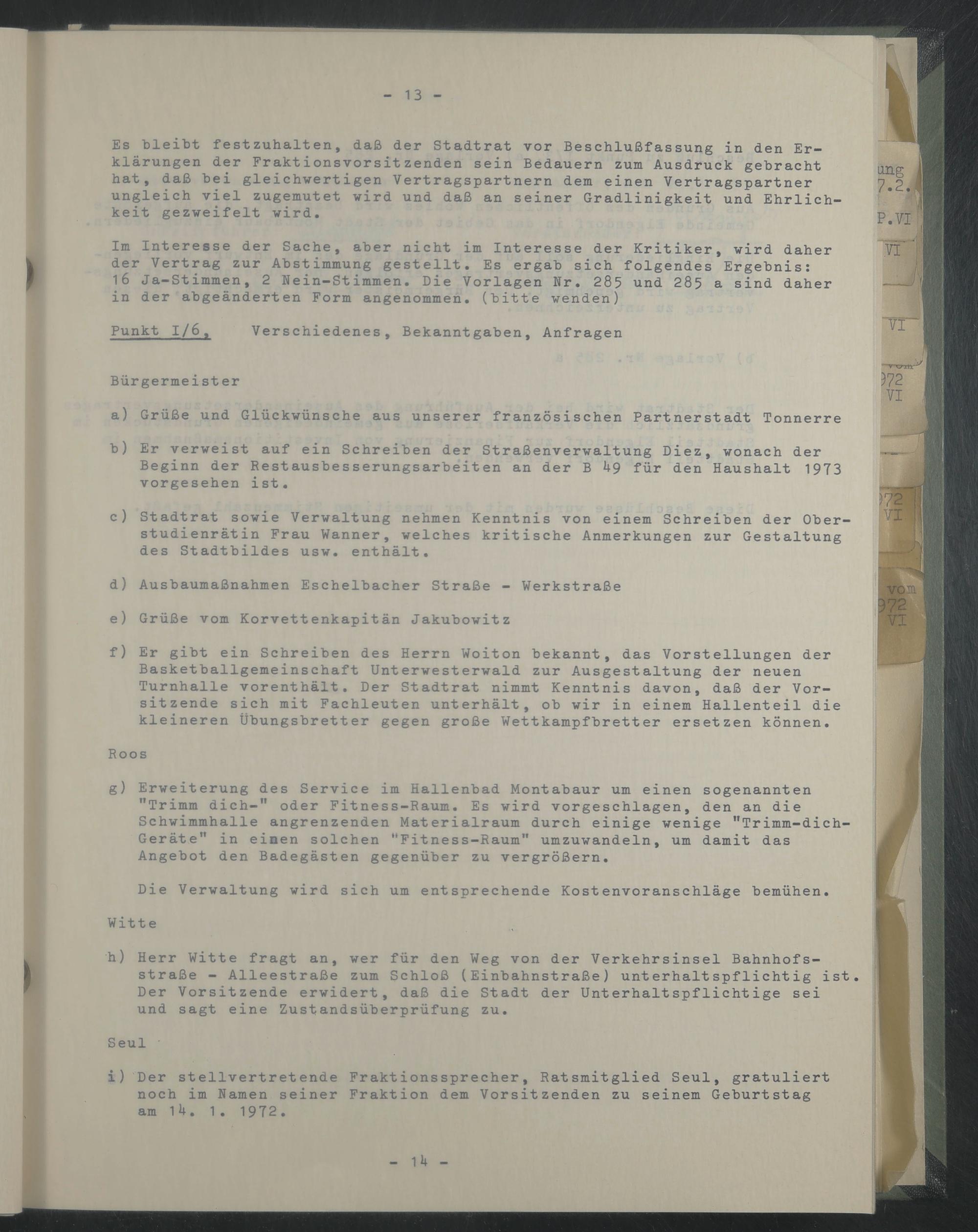 i) Der stellvertretende Fraktionssprecher, Ratsmitglied Seul, gratuliert noch im Namen seiner Fraktion dem Vorsitzenden zu seinem Geburtstag am 14. 1. 1972.