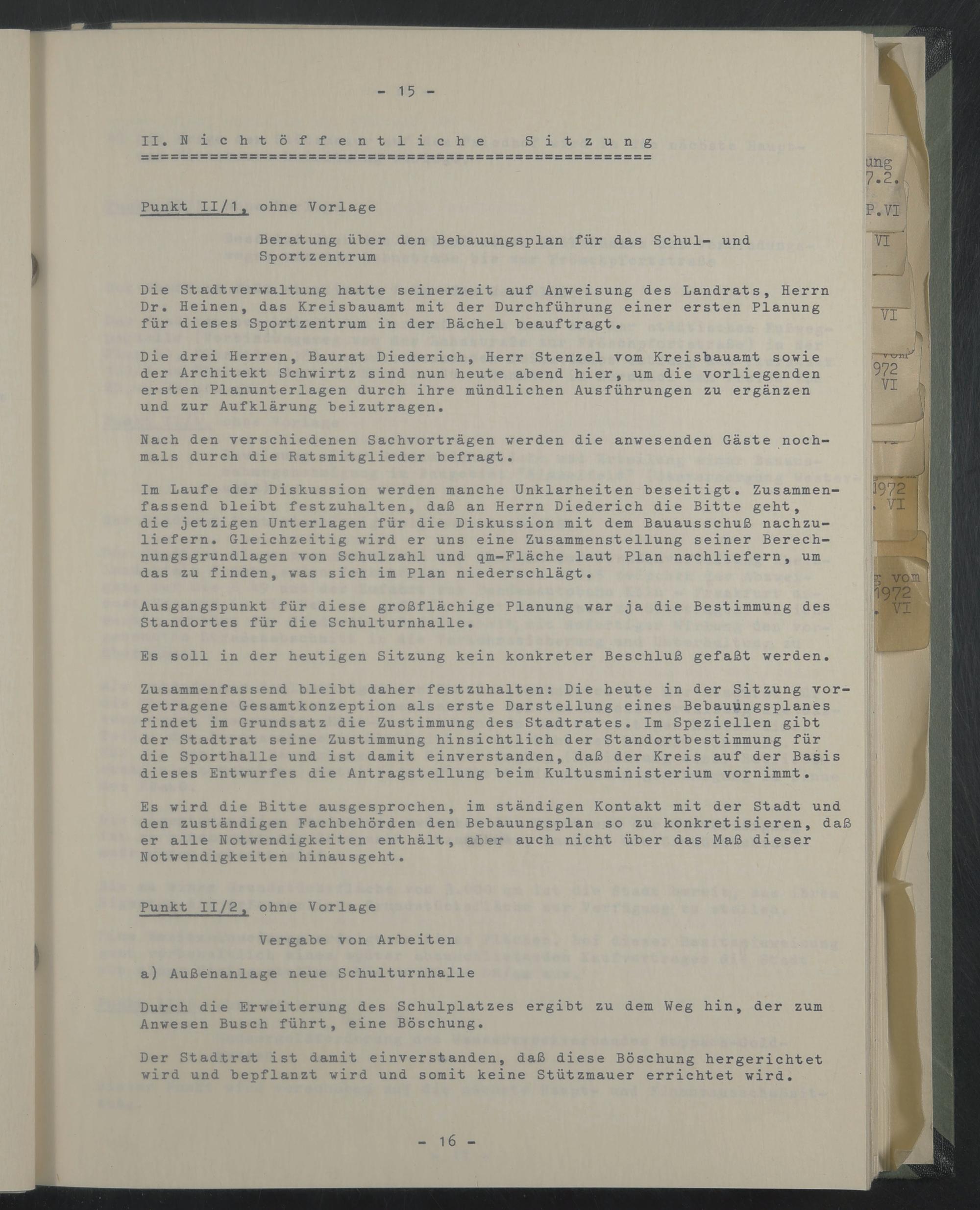 Zusammenfassend bleibt daher festzuhalten: Die heute in der Sitzung vorgetragene Gesamtkonzeption als erste Darstellung eines Bebauungsplanes findet im Grundsatz die Zustimmung des Stadtrates. Im Speziellen gibt der Stadtrat seine Zustimmung hinsichtlich der Standortbestimmung für die Sporthalle und ist damit einverstanden, daß der Kreis auf der Basis dieses Entwurfes die Antragstellung beim Kultusministerium vornimmt.