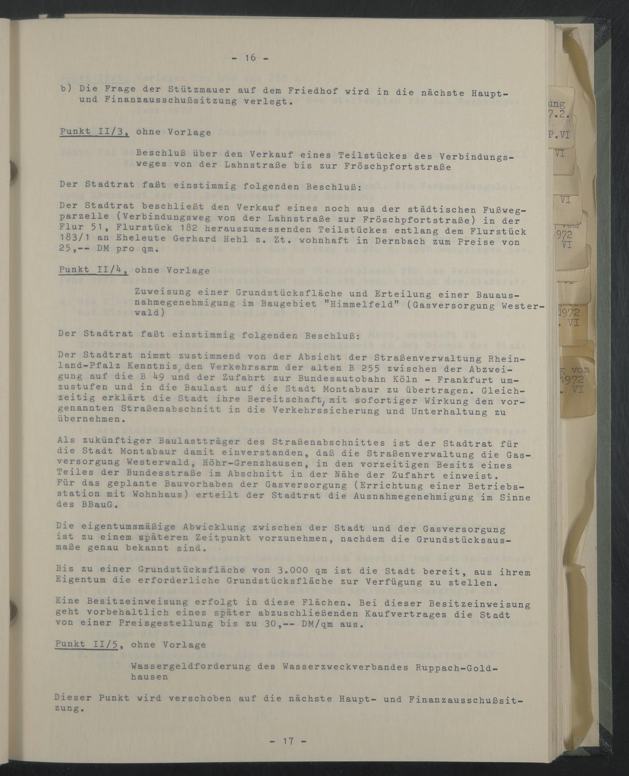 Als zukünftiger Baulastträger des Straßenabschnittes ist der Stadtrat für die Stadt Montabaur damit einverstanden, daß die Straßenverwaltung die Gasversorgung Westerwald, Höhr-Grenzhausen, in den vorzeitigen Besitz eines Teiles der Bundesstraße im Abschnitt in der Nähe der Zufahrt einweist.