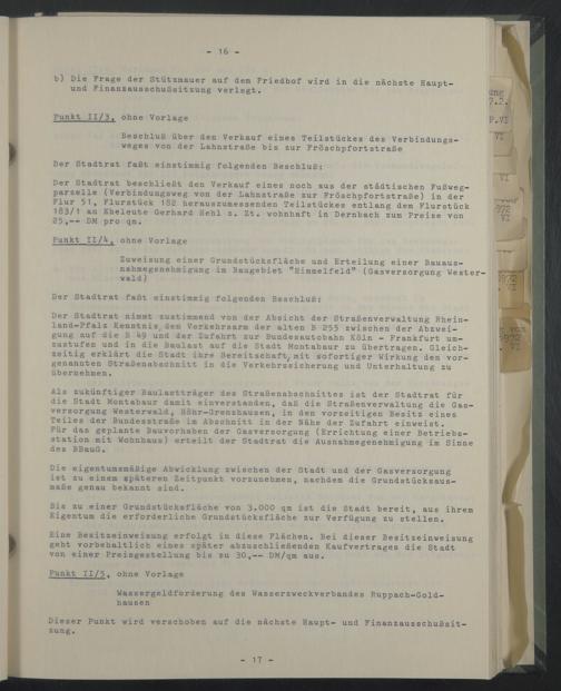 Der Stadtrat beschließt den Verkauf eines noch aus der städtischen Fußwegparzelle (Verbindungsweg von der Lahnstraße zur Fröschpfortstraße) in der Flur 51, Flurstück 182 herauszumessenden Teilstückes entlang dem Flurstück 183/1 an Eheleute Gerhard Hehl z. Zt. wohnhaft in Dernbach zum Preise von 25DM pro qm.