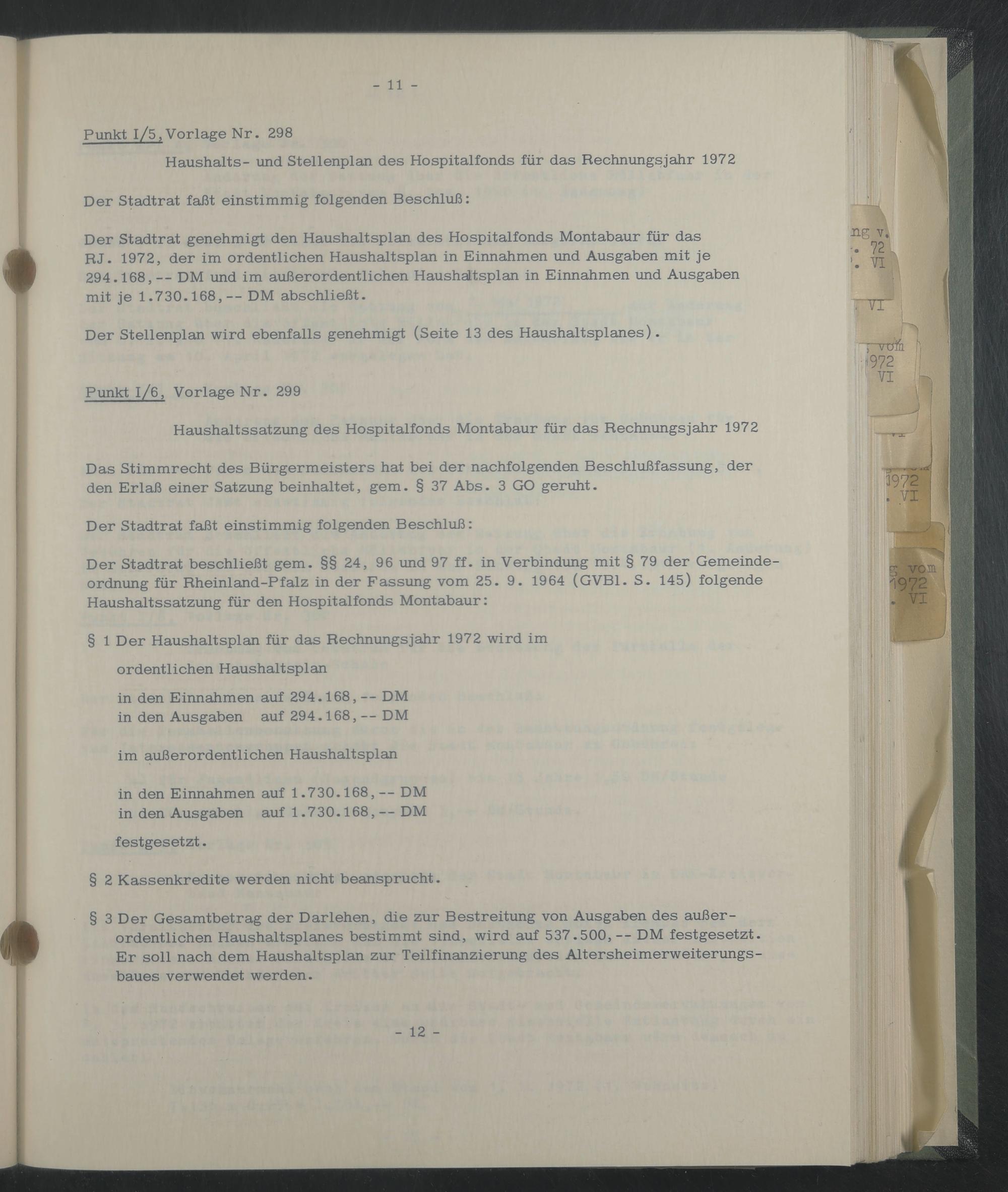 Der Stadtrat genehmigt den Haushaltsplan des Hospitalfonds Montabaur für das RJ. 1972, der im ordentlichen Haushaltsplan in Einnahmen und Ausgaben mit je 294.168,— DM und im außerordentlichen Haushaltsplan in Einnahmen und Ausgaben mit je 1.730.168,— DM abschließt.