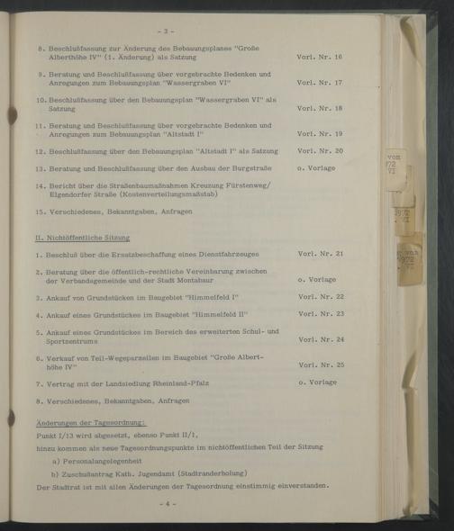 Punkt 1/13 wird abgesetzt, ebenso Punkt Il/l, hinzu kommen als neue Tagesordnungspunkte im nichtöffentlichen Teil der Sitzung