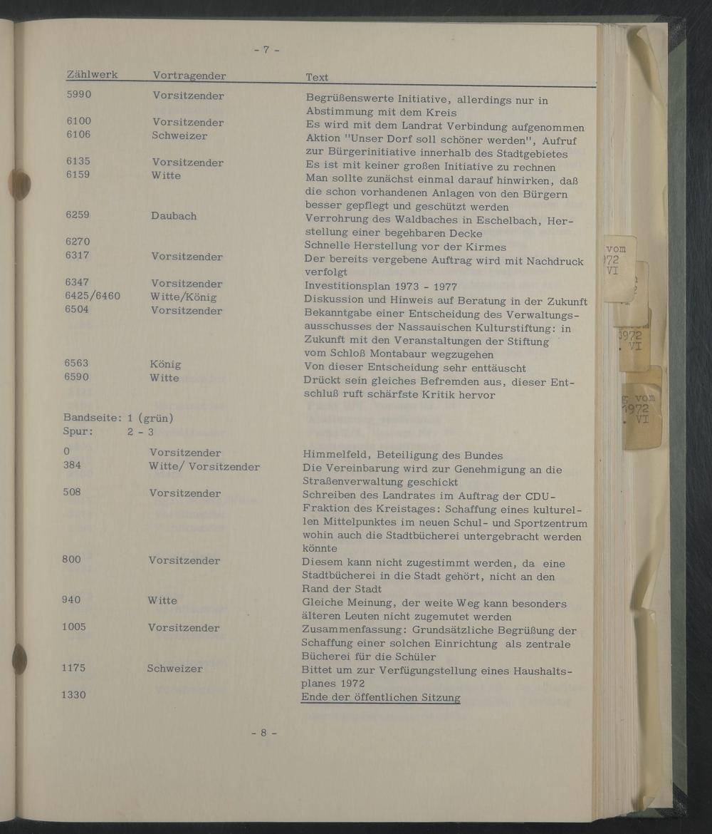 Es wird mit dem Landrat Verbindung aufgenommen Aktion "Unser Dorf soll schöner werden", Aufruf zur Bürgerinitiative innerhalb des Stadtgebietes Es ist mit keiner großen Initiative zu rechnen Man sollte zunächst einmal darauf hinwirken, daß die schon vorhandenen Anlagen von den Bürgern besser gepflegt und geschützt werden Verrohrung des Waldbaches in Eschelbach, Herstellung einer begehbaren Decke Schnelle Herstellung vor der Kirmes Der bereits vergebene Auftrag wird mit Nachdruck verfolgt