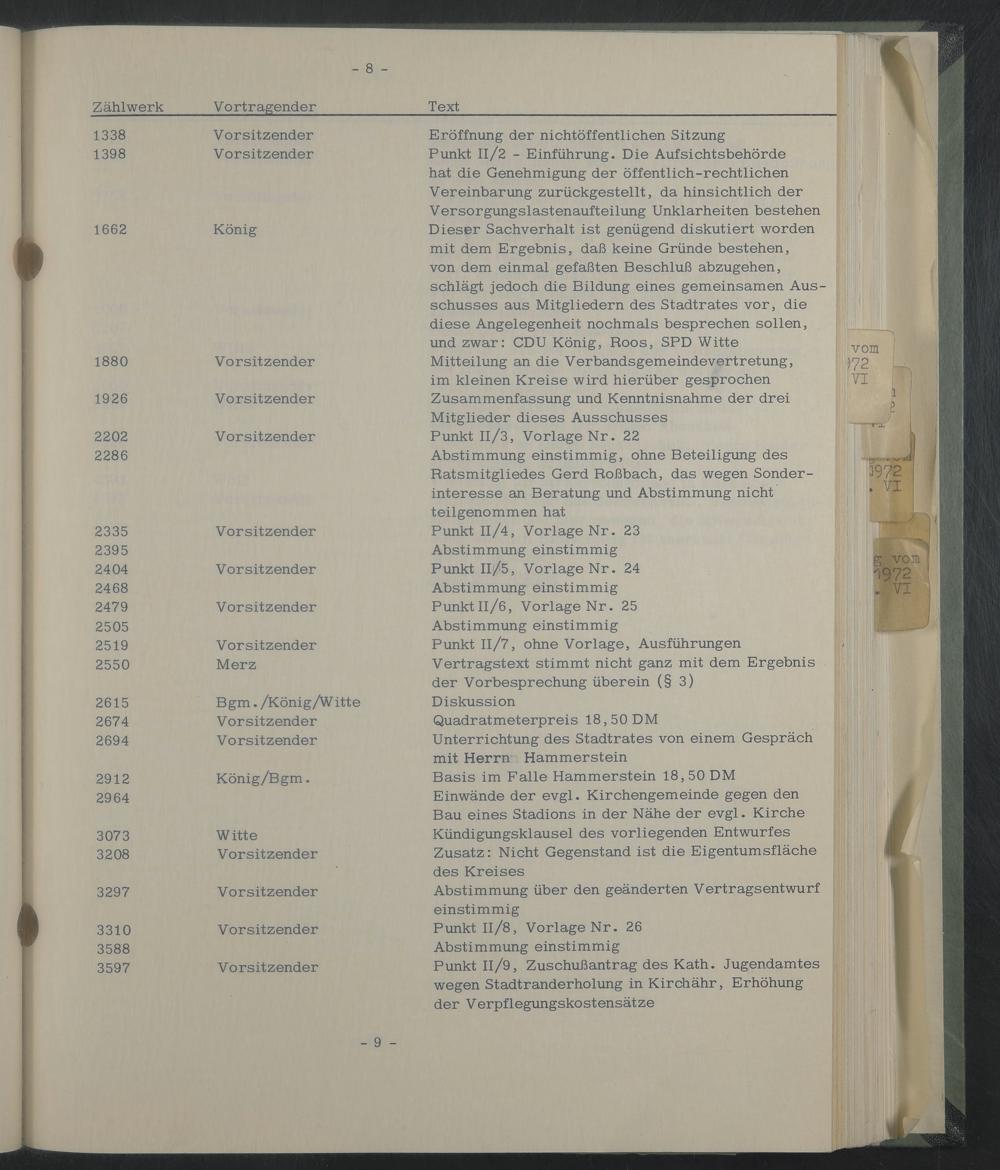 Eröffnung der nichtöffentlichen Sitzung Punkt 11/2 - Einführung. Die Aufsichtsbehörde hat die Genehmigung der öffentlich-rechtlichen Vereinbarung zurückgestellt, da hinsichtlich der Versorgungslastenaufteilung Unklarheiten bestehen Dieser Sachverhalt ist genügend diskutiert worden mit dem Ergebnis, daß keine Gründe bestehen, von dem einmal gefaßten Beschluß abzugehen, schlägt jedoch die Bildung eines gemeinsamen Ausschusses aus Mitgliedern des Stadtrates vor, die diese Angelegenheit nochmals besprechen sollen, und zwar: CDU König, Roos, SPD Witte Mitteilung an die Verbandsgemeindevertretung, im kleinen Kreise wird hierüber gesprochen Zusammenfassung und Kenntnisnahme der drei Mitglieder dieses Ausschusses Punkt 11/3, Vorlage Nr. 22 Abstimmung einstimmig, ohne Beteiligung des Ratsmitgliedes Gerd Roßbach, das wegen Sonderinteresse an Beratung und Abstimmung nicht teil genommen hat Punkt Il/4, Vorlage Nr. 23 Abstimmung einstimmig Punkt 11/5, Vorlage Nr. 24 Abstimmung einstimmig PunktIl/6, Vorlage Nr. 25 Abstimmung einstimmig Punkt 11/7, ohne Vorlage, Ausführungen Vertragstext stimmt nicht ganz mit dem Ergebnis der Vorbesprechung überein (§ 3)