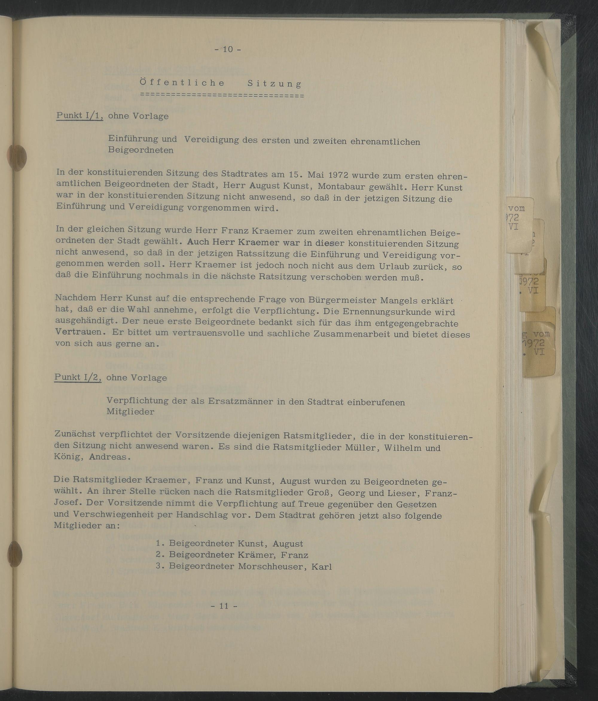 In der konstituierenden Sitzung des Stadtrates am 15. Mai 1972 wurde zum ersten ehrenamtlichen Beigeordneten der Stadt, Herr August Kunst, Montabaur gewählt. Herr Kunst war in der konstituierenden Sitzung nicht anwesend, so daß in der jetzigen Sitzung die Einführung und Vereidigung vorgenommen wird.