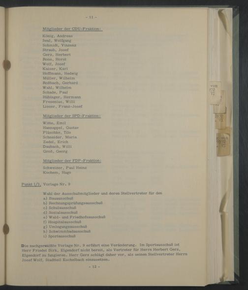 IB)ie nachgerefchte Vorlage Nr. 9 erfährt eine Veränderung. Im Sportausschuß ist Herr Friedei Birk, Eigendorf nicht bereit, als Vertreter für Herrn Herbert Gerz, Eigendorf zu fungieren. Herr Gerz schlägt daher vor, als seinen Stellvertreter Herrn Josef Wolf, Stadtteil Eschelbach einzusetzen.