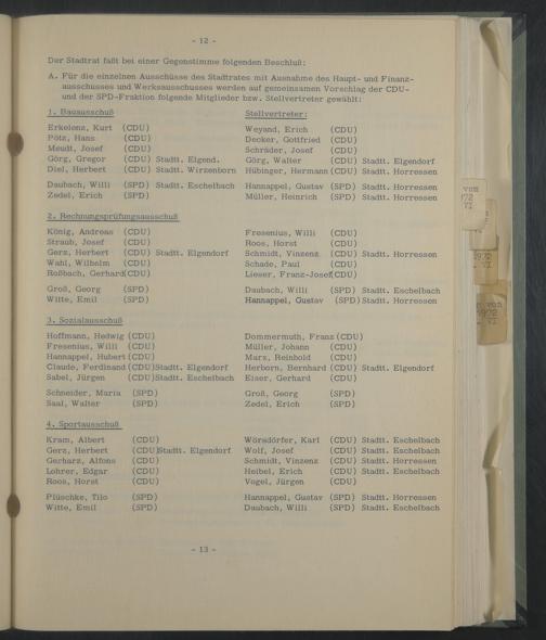 A. Für die einzelnen Ausschüsse des Stadtrates mit Ausnahme des Haupt- und Finanzausschusses und Werksausschusses werden auf gemeinsamen Vorschlag der CDU- und der SPD-Fraktion folgende Mitglieder bzw. Stellvertreter gewählt: