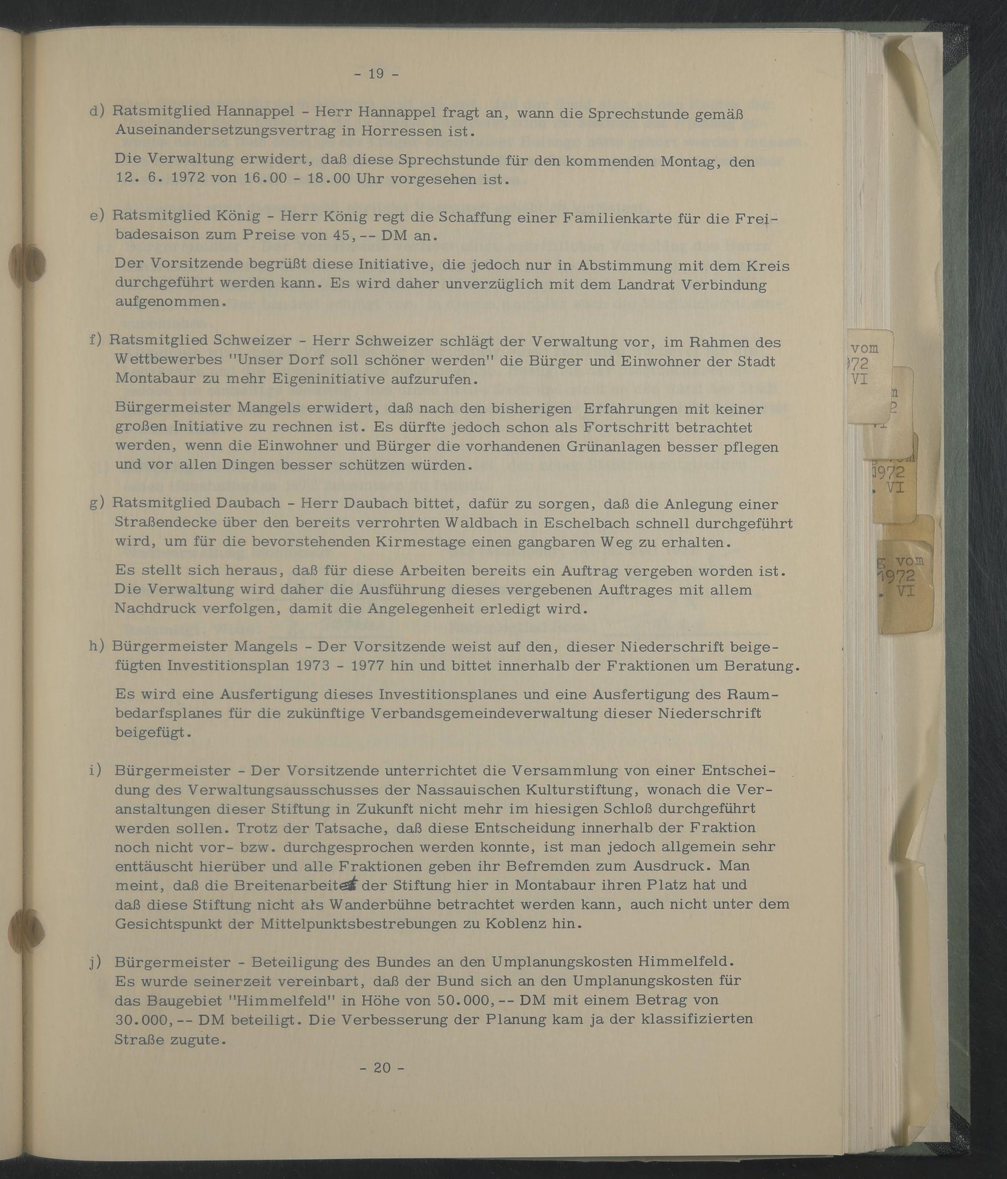h) Bürgermeister Mangels - Der Vorsitzende weist auf den, dieser Niederschrift beigefügten Investitionsplan 1973 - 1977 hin und bittet innerhalb der Fraktionen um Beratung.