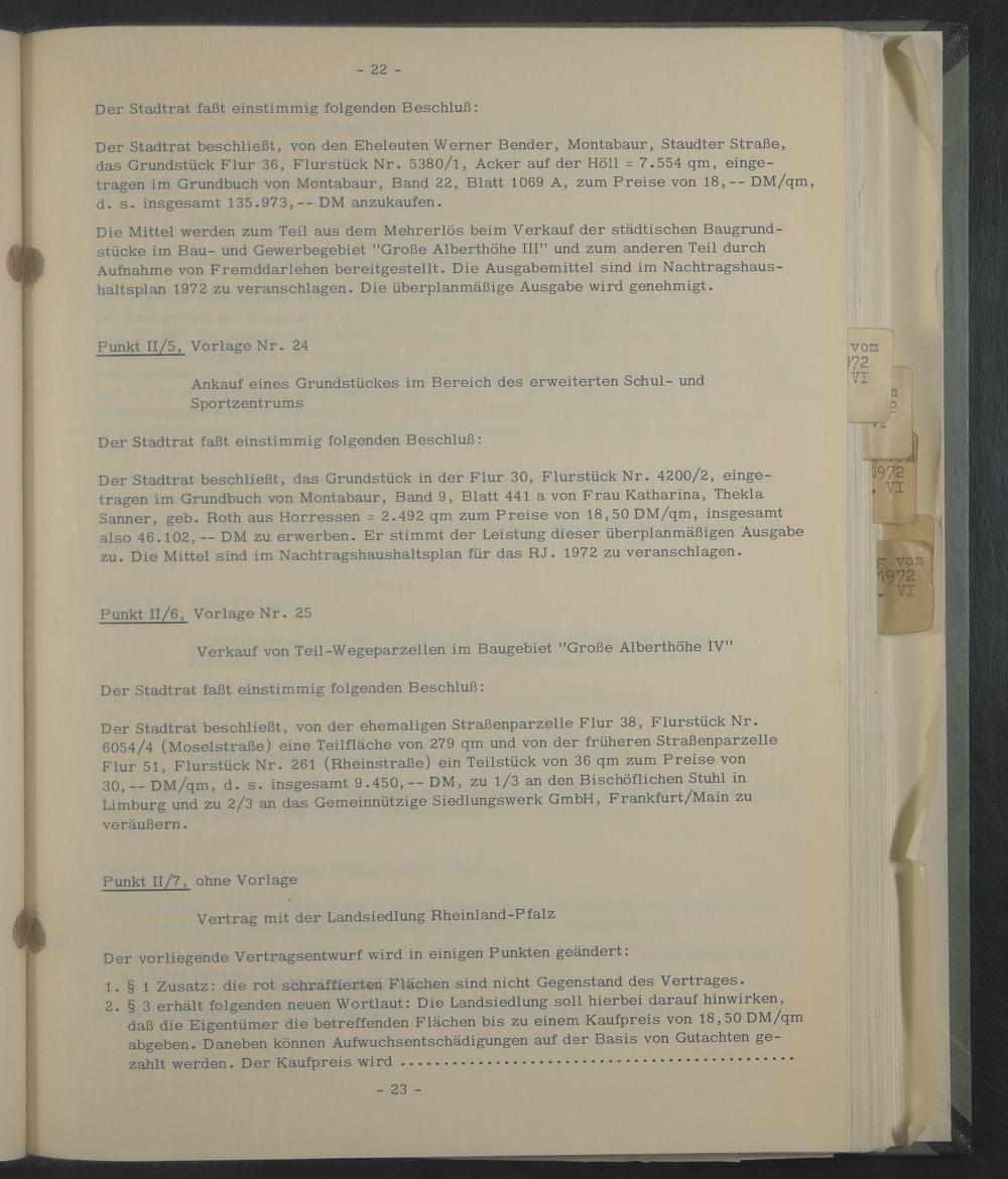 Der Stadtrat beschließt, von den Eheleuten Werner Bender, Montabaur, Staudter Straße, das Grundstück Flur 36, Flurstück Nr. 5380/1, Acker auf der Höll = 7.554 qm, eingetragen im Grundbuch von Montabaur, Band 22, Blatt 1069 A, zum Preise von 18,— DM/qm, d. s. insgesamt 135.973,-- DM anzukaufen.