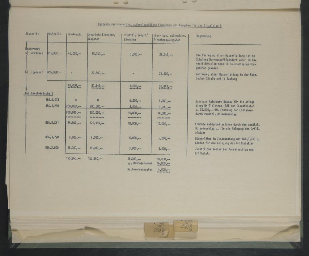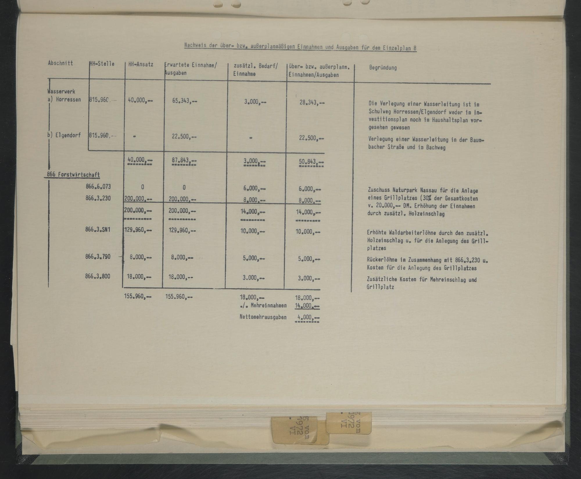Zuschuss Naturpark Nassau für die Anlage eines Grill platzes (30% der Gesamtesten v. 20.000,— 0M. Erhöhung der Einnahmen durch zusätzl. Holzeinschlag