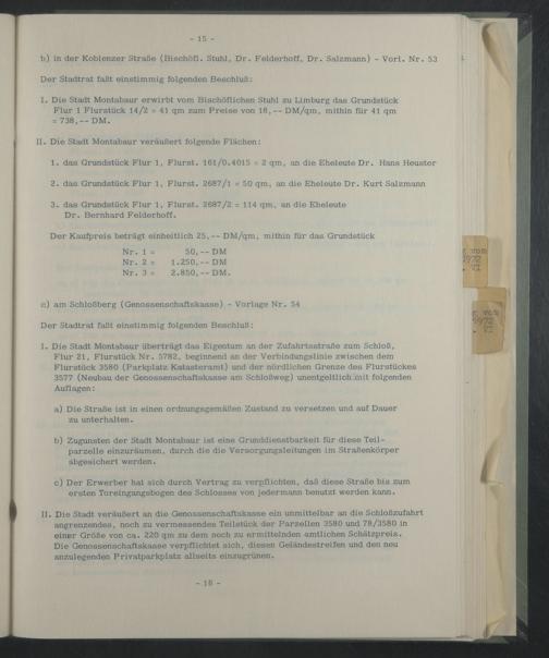 II. Die Stadt veräußert an die Genossenschaftskasse ein unmittelbar an die Schloßzufahrt angrenzendes, noch zu vermessendes Teilstück der Parzellen 3580 und 78/3580 in einer Größe von ca. 220 qm zu dem noch zu ermittelnden amtlichen Schätzpreis.