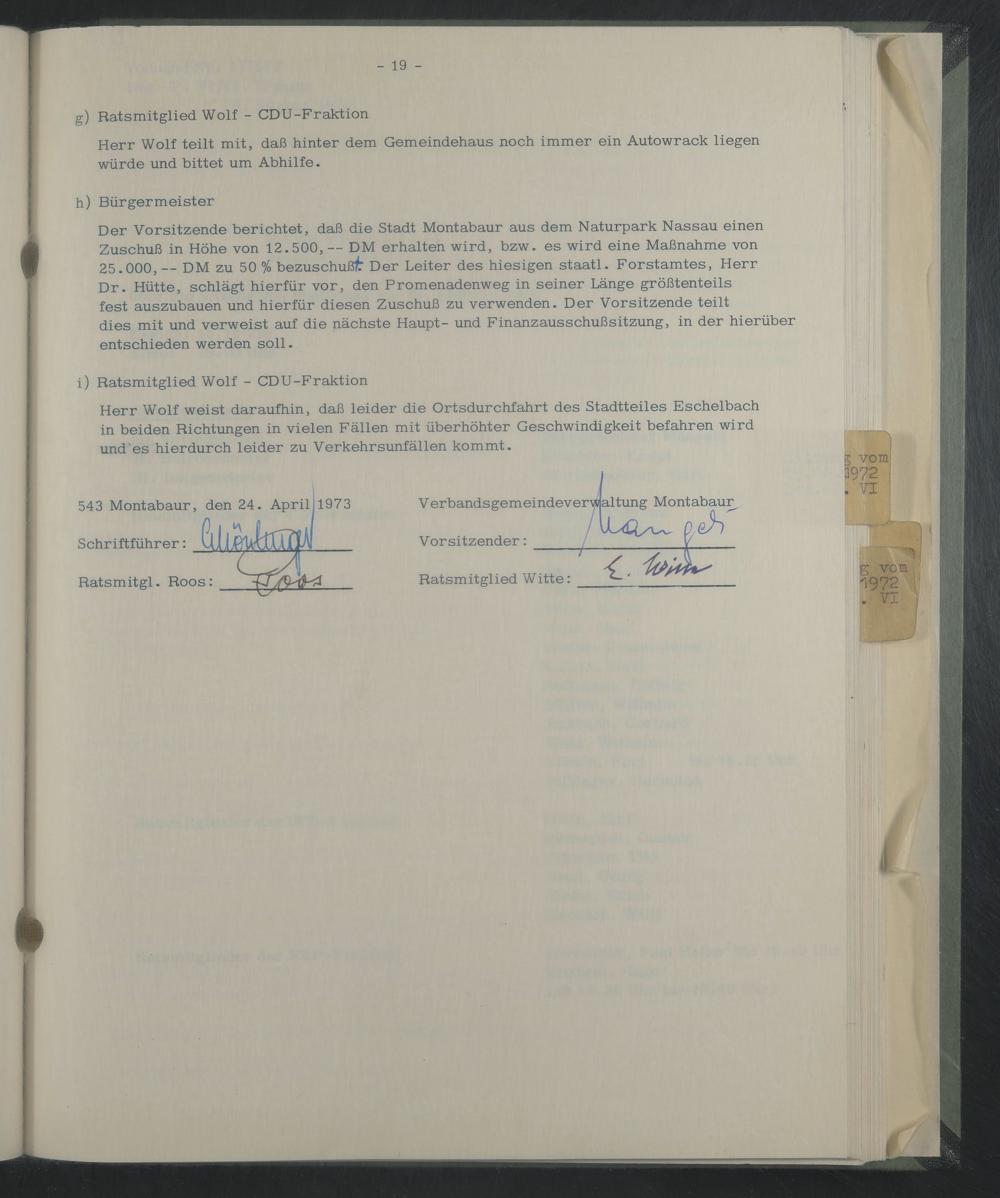 Der Vorsitzende berichtet, daß die Stadt Montabaur aus dem Naturpark Nassau einen Zuschuß in Höhe von 12.500, — DM erhalten wird, bzw. es wird eine Maßnahme von 25.000, — DM zu 50 % bezuschußf^ Der Leiter des hiesigen staatl. Forstamtes, Herr Dr. Hütte, schlägt hierfür vor, den Promenadenweg in seiner Länge größtenteils fest auszubauen und hierfür diesen Zuschuß zu verwenden. Der Vorsitzende teilt dies mit und verweist auf die nächste Haupt- und Finanzausschußsitzung, in der hierüber entschieden werden soll.