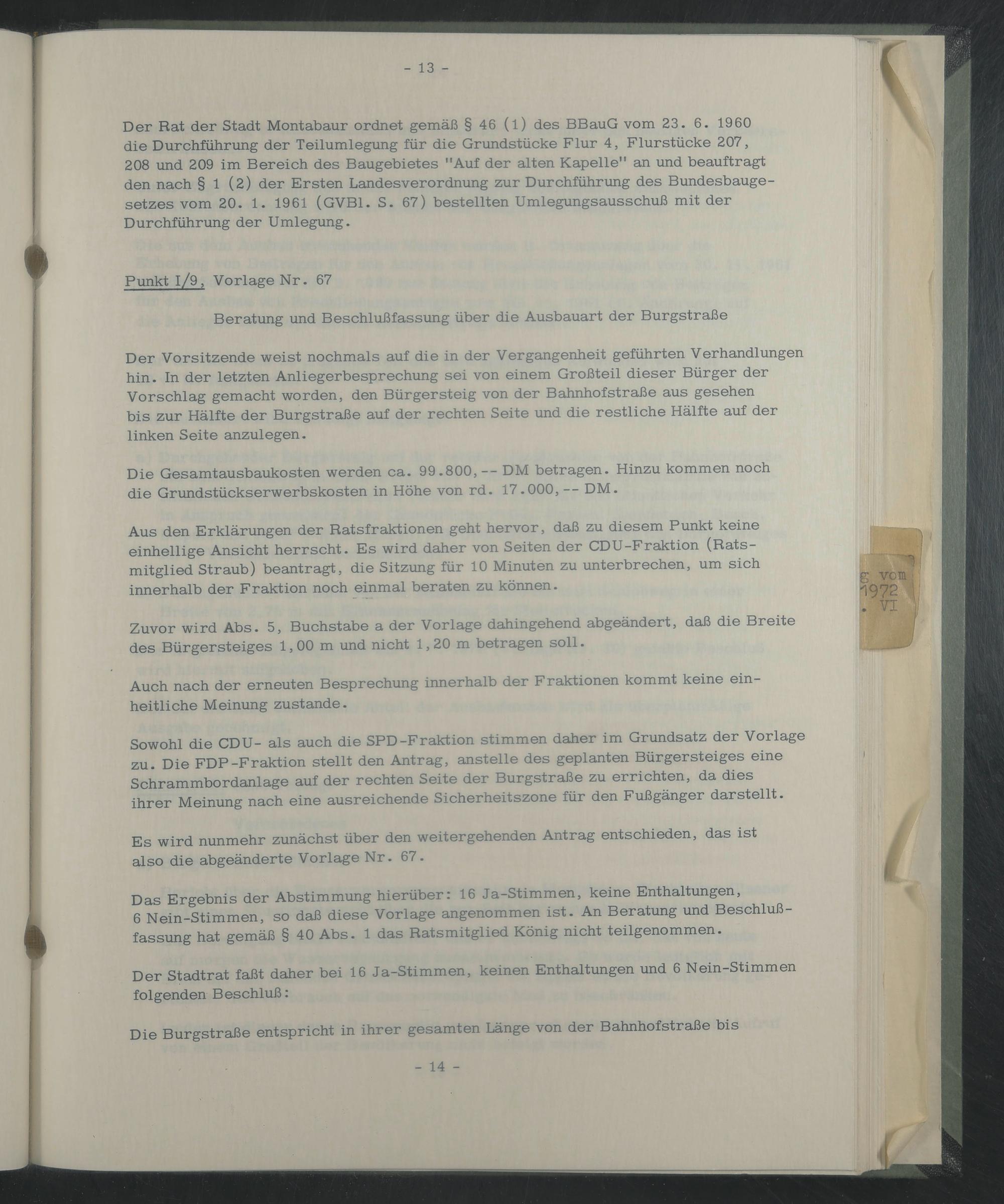 Sowohl die CDU- als auch die SPD-Fraktion stimmen daher im Grundsatz der Vorlage zu. Die FDP-Fraktion stellt den Antrag, anstelle des geplanten Bürgersteiges eine Schrammbordanlage auf der rechten Seite der Burgstraße zu errichten, da dies ihrer Meinung nach eine ausreichende Sicherheitszone für den Fußgänger darstellt.