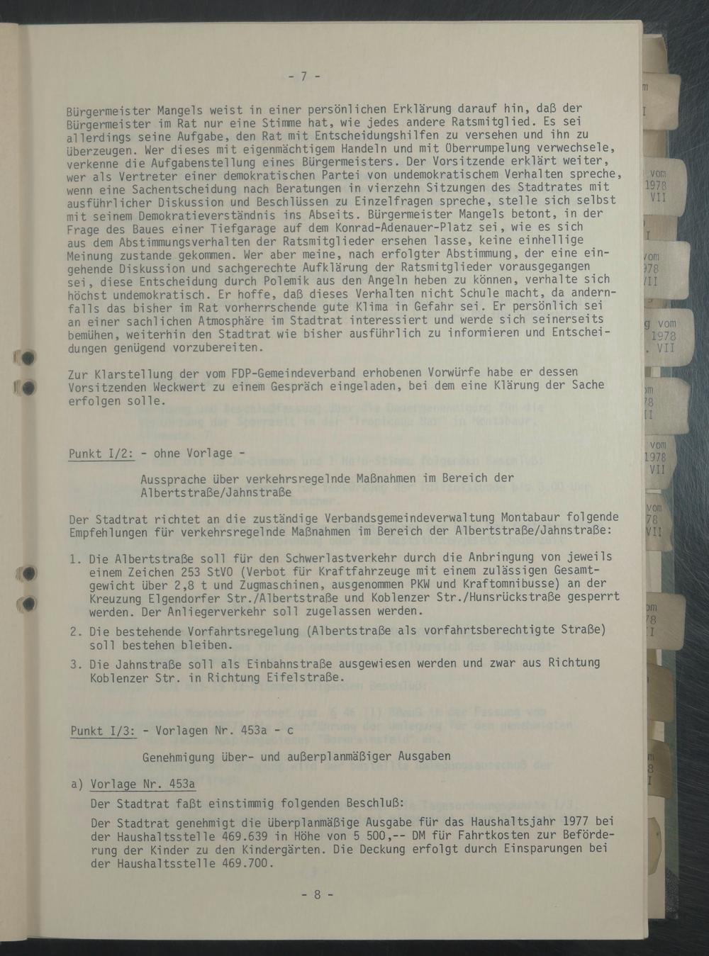 Bürgermeister Mangels weist in einer persönlichen Erklärung darauf hin, daß der Bürgermeister im Rat nur eine Stimme hat, wie jedes andere Ratsmitglied. Es sei allerdings seine Aufgabe, den Rat mit Entscheidungshilfen zu versehen und ihn zu überzeugen. Wer dieses mit eigenmächtigem Handeln und mit Überrumpelung verwechsele, verkenne die Aufgabenstellung eines Bürgermeisters. Der Vorsitzende erklärt weiter, wer als Vertreter einer demokratischen Partei von undemokratischem Verhalten spreche, wenn eine Sachentscheidung nach Beratungen in vierzehn Sitzungen des Stadtrates mit ausführlicher Diskussion und Beschlüssen zu Einzelfragen spreche, stelle sich selbst mit seinem Demokratieverständnis ins Abseits. Bürgermeister Mangels betont, in der Frage des Baues einer Tiefgarage auf dem Konrad-Adenauer-Platz sei, wie es sich aus dem Abstimmungsverhalten der Ratsmitglieder ersehen lasse, keine einhellige Meinung zustande gekommen. Wer aber meine, nach erfolgter Abstimmung, der eine eingehende Diskussion und sachgerechte Aufklärung der Ratsmitglieder vorausgegangen sei, diese Entscheidung durch Polemik aus den Angeln heben zu können, verhalte sich höchst undemokratisch. Er hoffe, daß dieses Verhalten nicht Schule macht, da andernfalls das bisher im Rat vorherrschende gute Klima in Gefahr sei. Er persönlich sei an einer sachlichen Atmosphäre im Stadtrat interessiert und werde sich seinerseits bemühen, weiterhin den Stadtrat wie bisher ausführlich zu informieren und Entscheidungen genügend vorzubereiten.