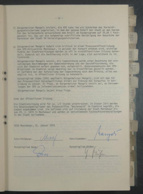 Die Stadtratsitzung wird für ca. 1/2 Stunde unterbrochen. In dieser Zeit werden die Besatzungsmitglieder des Patenschiffes "Westerwald" im Stadtrat begrüßt, die soeben angekommen sind. Sie befinden sich auf Einladung der Stadt Montabaur bis zum 29. 1. 1978 in Montabaur und werden an verschiedenen Fastnachtsveranstaltungen in der Stadt teilnehmen.