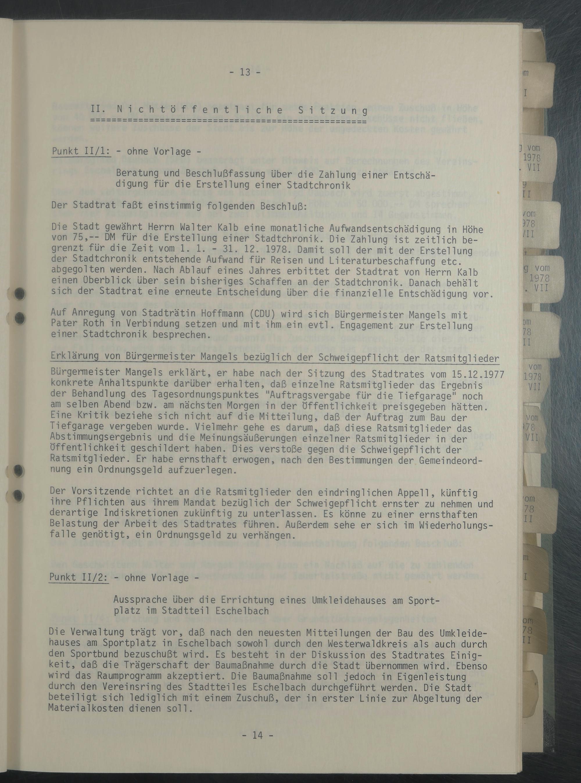 Bürgermeister Mangels erklärt, er habe nach der Sitzung des Stadtrates vom 15.12.1977 konkrete Anhaltspunkte darüber erhalten, daß einzelne Ratsmitglieder das Ergebnis der Behandlung des Tagesordnungspunktes "Auftragsvergabe für die Tiefgarage" noch am selben Abend bzw. am nächsten Morgen in der Öffentlichkeit preisgegeben hätten. Eine Kritik beziehe sich nicht auf die Mitteilung, daß der Auftrag zum Bau der Tiefgarage vergeben wurde. Vielmehr gehe es darum, daß diese Ratsmitglieder das Abstimmungsergebnis und die Meinungsäußerungen einzelner Ratsmitglieder in der Öffentlichkeit geschildert haben. Dies verstoße gegen die Schweigepflicht der Ratsmitglieder. Er habe ernsthaft erwogen, nach den Bestimmungen der Gemeindeordnung ein Ordnungsgeld aufzuerlegen.