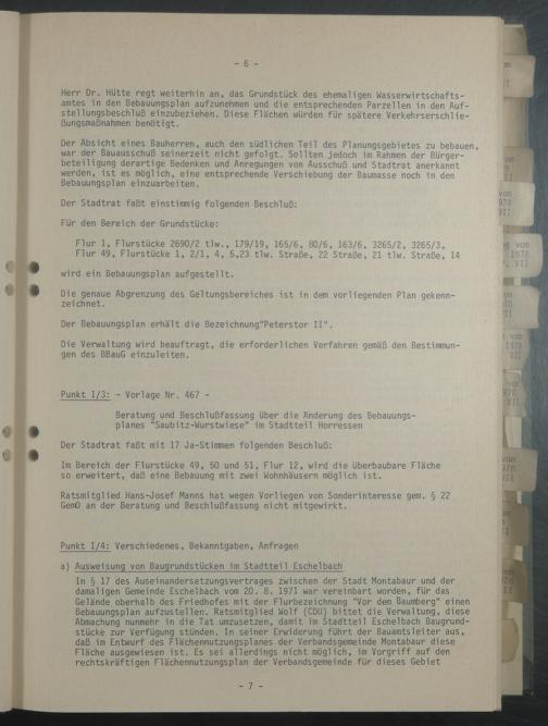 In § 17 des Auseinandersetzungsvertrages zwischen der Stadt Montabaur und der damaligen Gemeinde Eschelbach vom 20. 8. 1971 war vereinbart worden, für das Gelände oberhalb des Friedhofes mit der Flurbezeichnung "Vor dem Baumberg" einen Bebauungsplan aufzustellen. Ratsmitglied Wolf (CDU) bittet die Verwaltung, diese Abmachung nunmehr in die Tat umzusetzen, damit im Stadtteil Eschelbach Baugrundstücke zur Verfügung stünden. In seiner Erwiderung führt der Bauamtsleiter aus, daß im Entwurf des Flächennutzungsplanes der Verbandsgemeinde Montabaur diese Fläche ausgewiesen ist. Es sei allerdings nicht möglich, im Vorgriff auf den rechtskräftigen Flächennutzungsplan der Verbandsgemeinde für dieses Gebiet