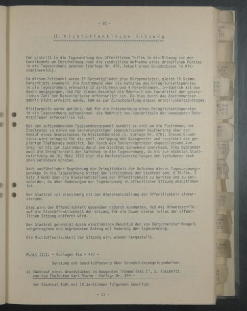 Bei dem aufzunehmenden Tagesordnungspunkt handelt es sich um die Zustimmung des Stadtrates zu einem vom Sanierungsträger abgeschlossenen Kaufvertrag über den Ankauf eines Grundstückes im Altstadtbereich (s. Vorlage Nr. 470). Dieses Grundstück wird dringend für die evtl. Verlegung der Garagenein- und -ausfahrt der geplanten Tiefgarage benötigt. Der durch den Sanierungsträger abgeschlossene Vertrag ist bis zur Zustimmung durch den Stadtrat schwebend unwirksam. Dies begründet auch die Dringlichkeit der Aufnahme in die Tagesordnung, da bis zur nächsten Stadtratsitzung am 16. März 1978 sich die Kaufpreisvorstellungen der Veräußerer nach oben verändern könnten.