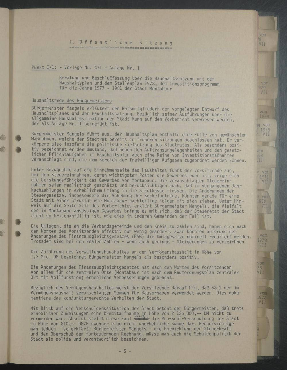 Beratung und Beschlußfassung über die Haushaltssatzung mit dem Haushaltsplan und dem Stellenplan 1978, dem Investitionsprogramm für die Jahre 1977 - 1981 der Stadt Montabaur