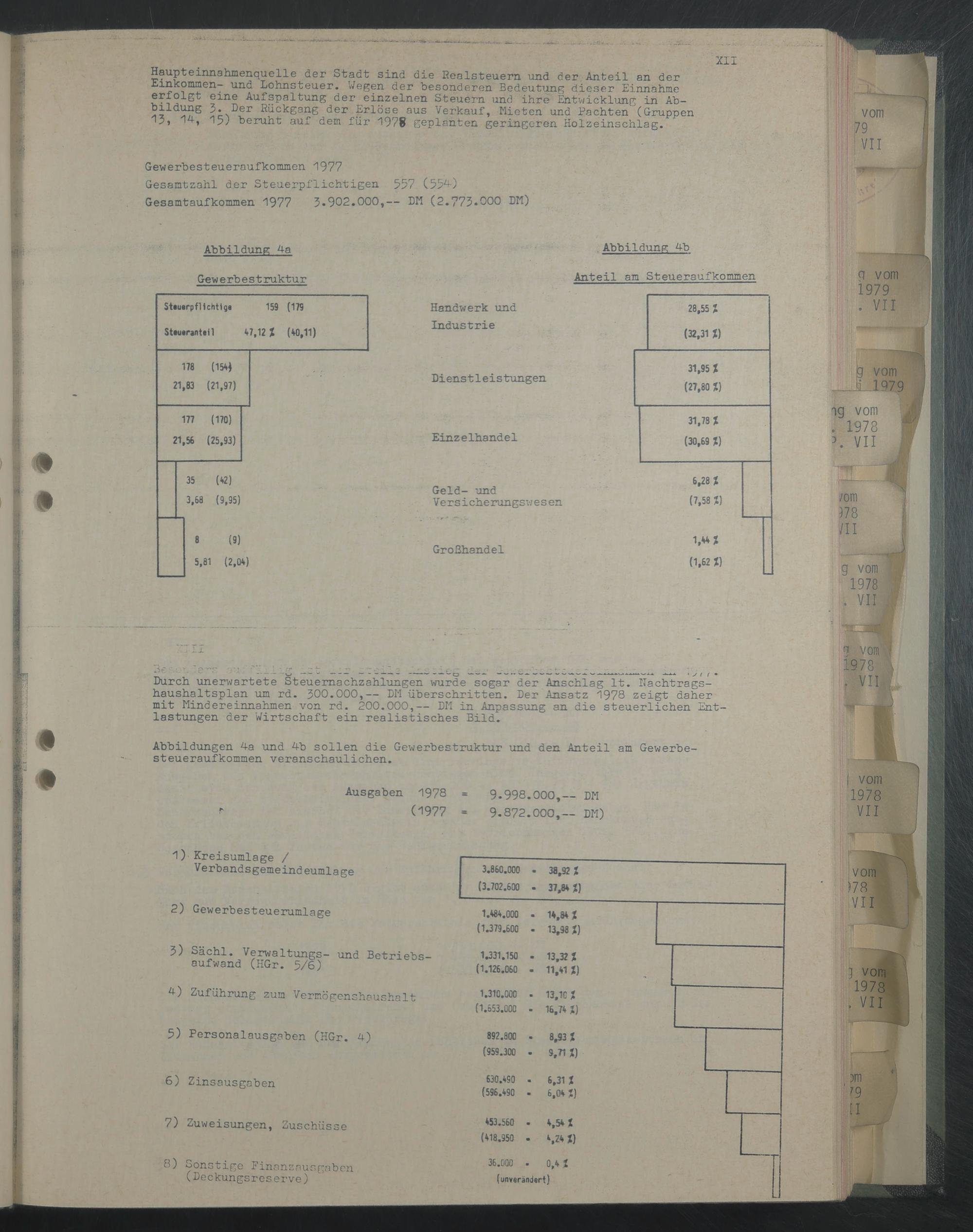 Durch unerwartete Steuemachzahlungen wurde sogar der Anschlag lt. Nachtragshaushaltsplan um rd. 300.000,— DM überschritten. Der Ansatz 1978 zeigt daher mit Mindereinnahmen von rd. 200.000,— DM in Anpassung an die steuerlichen Entlastungen der Wirtschaft ein realistisches Bild.
