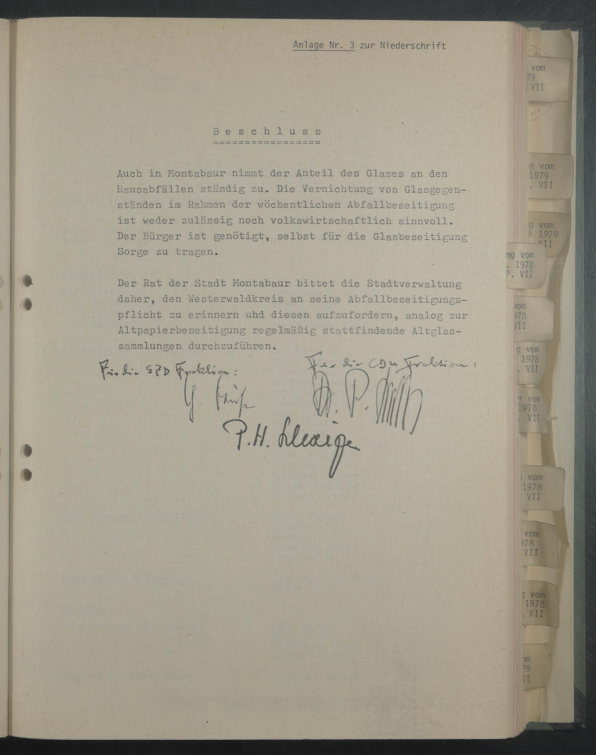 Der Rat der Stadt Montabaur bittet die Stadtverwaltung daher, den Westerwaldkreis an seine Abfallbeseitigungspflicht zu erinnern uhd diesen aufzufordern, analog zur Altpapierbeseitigung regelmäßig stattfindende Altglassammlungen durchzuführen.