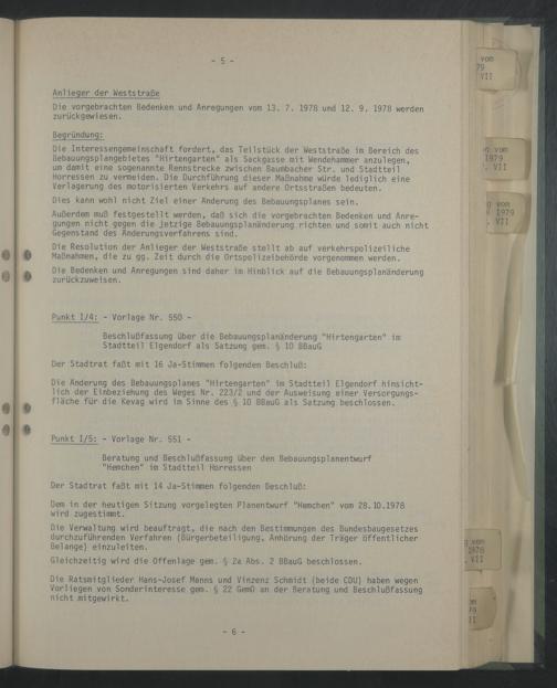 Die Ratsmitglieder Hans-Josef Manns und Vinzenz Schmidt (beide CDU) haben wegen Vorliegen von Sonderinteresse gern. § 22 GemO an der Beratung und Beschlußfassung nicht mitgewirkt.