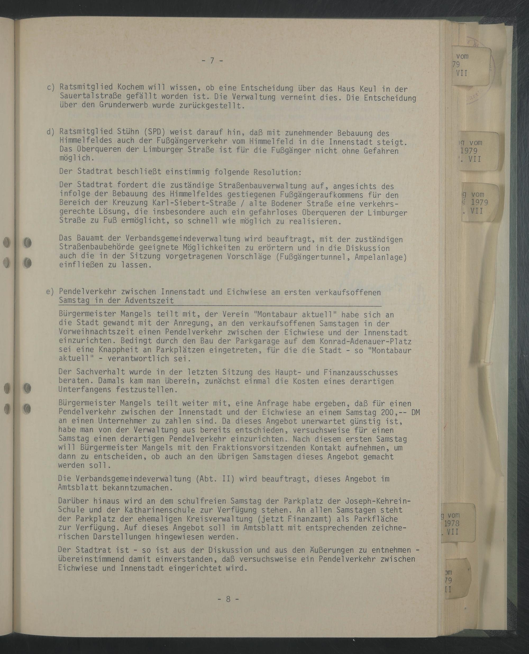 d) Ratsmitglied Stühn (SPD) weist darauf hin, daß mit zunehmender Bebauung des Himmelfeldes auch der Fußgängerverkehr vom Himmelfeld in die Innenstadt steigt. Das überqueren der Limburger Straße ist für die Fußgänger nicht ohne Gefahren möglich.