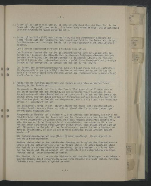 c) Ratsmitglied Kochern will wissen, ob eine Entscheidung über das Haus Keul in der Sauertal Straße gefallt worden ist. Die Verwaltung verneint dies. Die Entscheidung über den Grunderwerb wurde zurückgestellt.