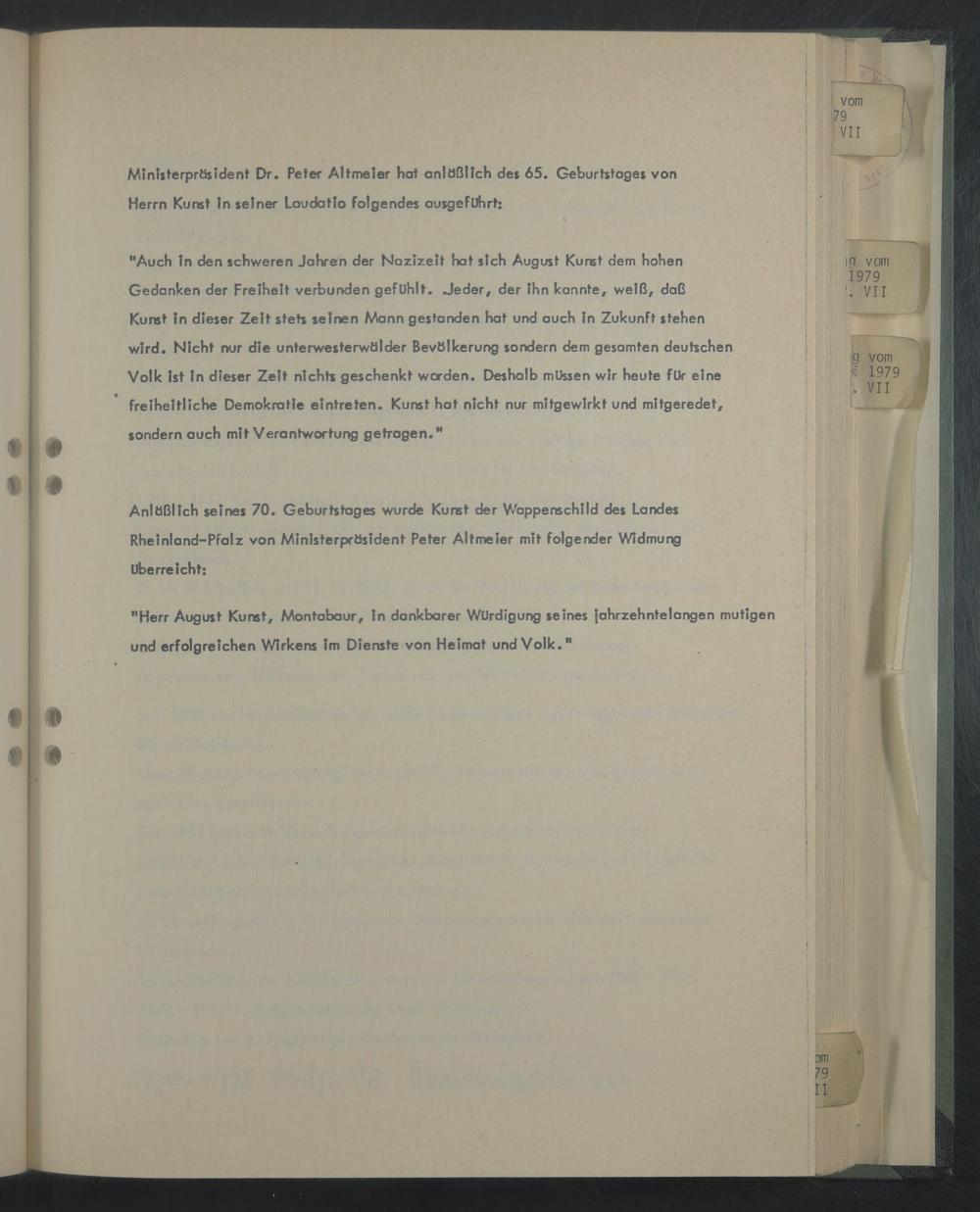 "Auch In den schweren Jahren der Nazizeit hat sich August Kunst dem hohen Gedanken der Freiheit verbunden gefühlt. Jeder, der Ihn kannte, weiß, daß Kunst In dieser Zelt stets seinen Mann gestanden hat und auch In Zukunft stehen wird. Nicht nur die unterwesterwölder Bevölkerung sondern dem gesamten deutschen Volk Ist In dieser Zelt nichts geschenkt worden. Deshalb mUssen wir heute fUr eine freiheitliche Demokratie elntreten. Kunst hat nicht nur mitgewirkt und mitgeredet, sondern auch mit Verantwortung getragen."