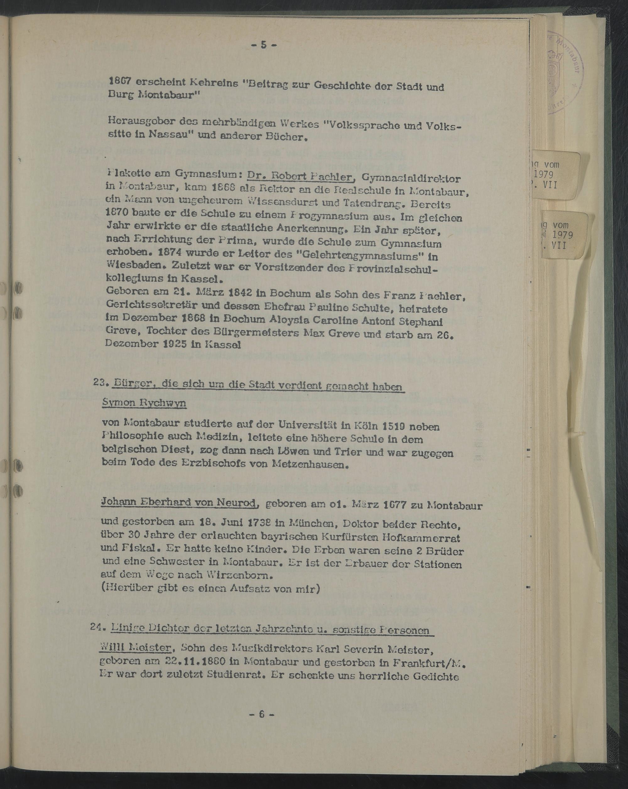Plakette am Gymnasium: Dr. Robert Pachter. Gymnasialdirektor in Montabaur, kam 186S als Rektor an die Realschule in Montabaur, ein Mann von ungeheurem Wissensdurst und Tatendrang. Bereits 1670 baute er die Schule zu einem Frogymnasium aus. Im gleichen Jahr erwirkte er die staatliche Anerkennung. Ein Jahr später, nach Errichtung der Prima, wurde die Schule zum Gymnasium erhoben. 1874 wurde er Leiter des "Gelehrtengymnasiums" in Wiesbaden. Zuletzt war er Vorsitzender des F rovinzial schul- kolleglums ln Kassel.