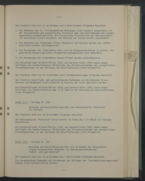 Die Ratsmitglieder Wilhelm Müller (CDU) und Gerhard Stühn (SPD) haben wegen Vorliegen von Sonderinteresse (Mitglieder des Kirchenvorstandes der evangelischen Kirchengemeinde) an der Beratung und Beschlußfassung nicht mitgewirkt.