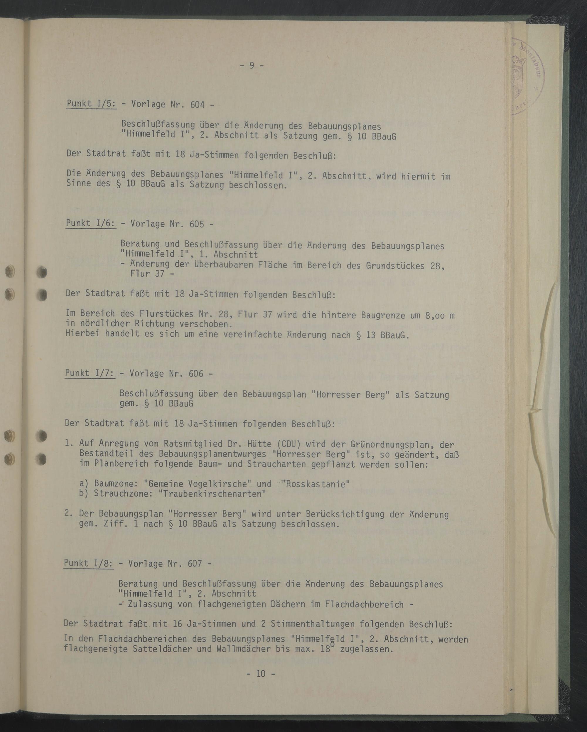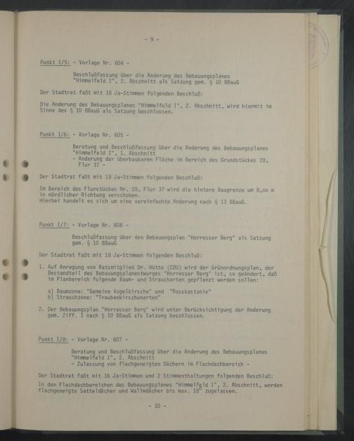 1. Auf Anregung von Ratsmitglied Dr. Hütte (CDU) wird der Grünordnungsplan, der Bestandteil des Bebauungsplanentwurges "Horresser Berg" Ist, so geändert, daß Im Planberelch folgende Baum- und Straucharten gepflanzt werden sollen: