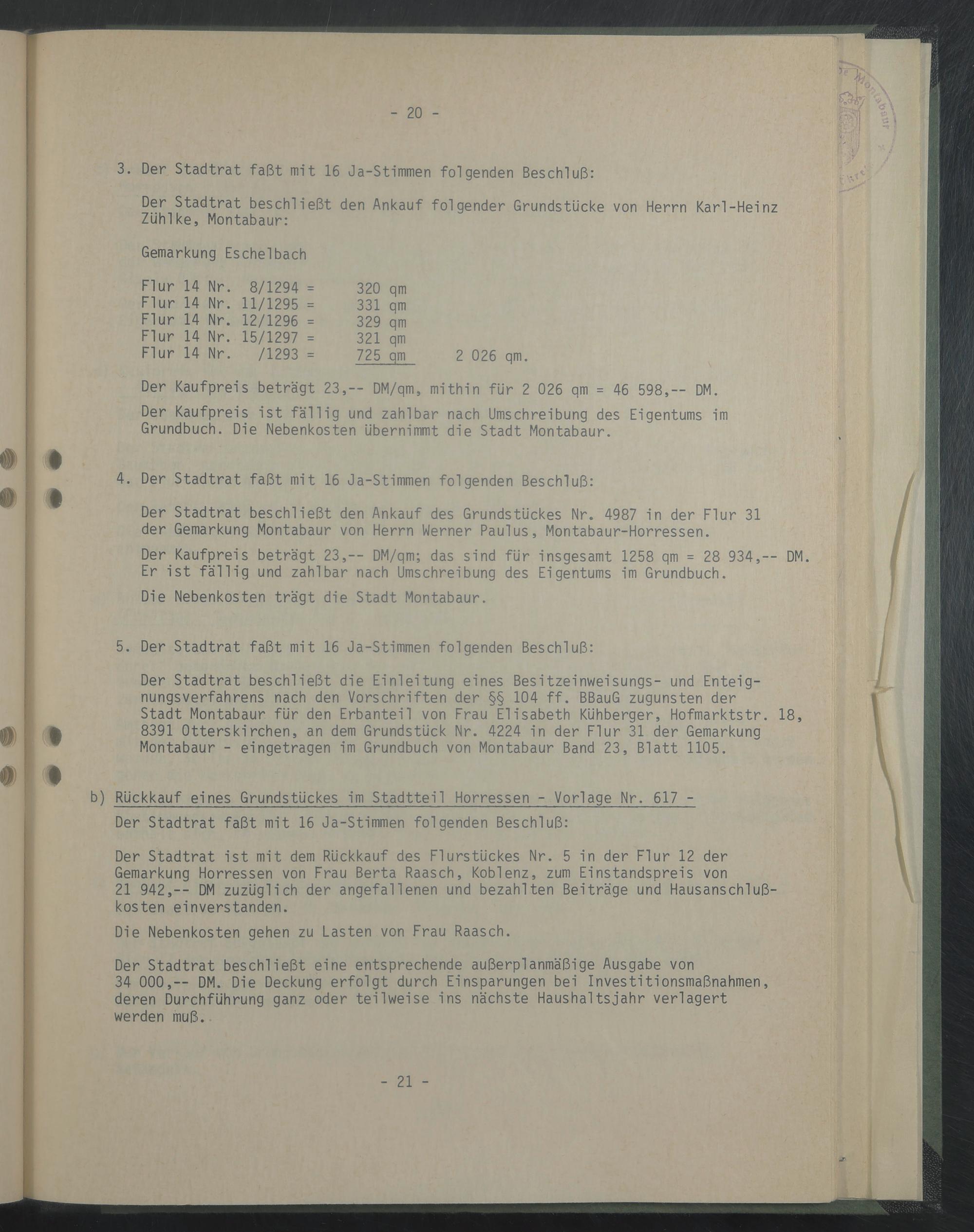 Der Stadtrat ist mit dem Rückkauf des Flurstückes Nr. 5 in der Flur 12 der Gemarkung Horressen von Frau Berta Raasch, Koblenz, zum Einstandspreis von 21 942,-- DM zuzüglich der angefallenen und bezahlten Beiträge und Hausanschlußkosten einverstanden.