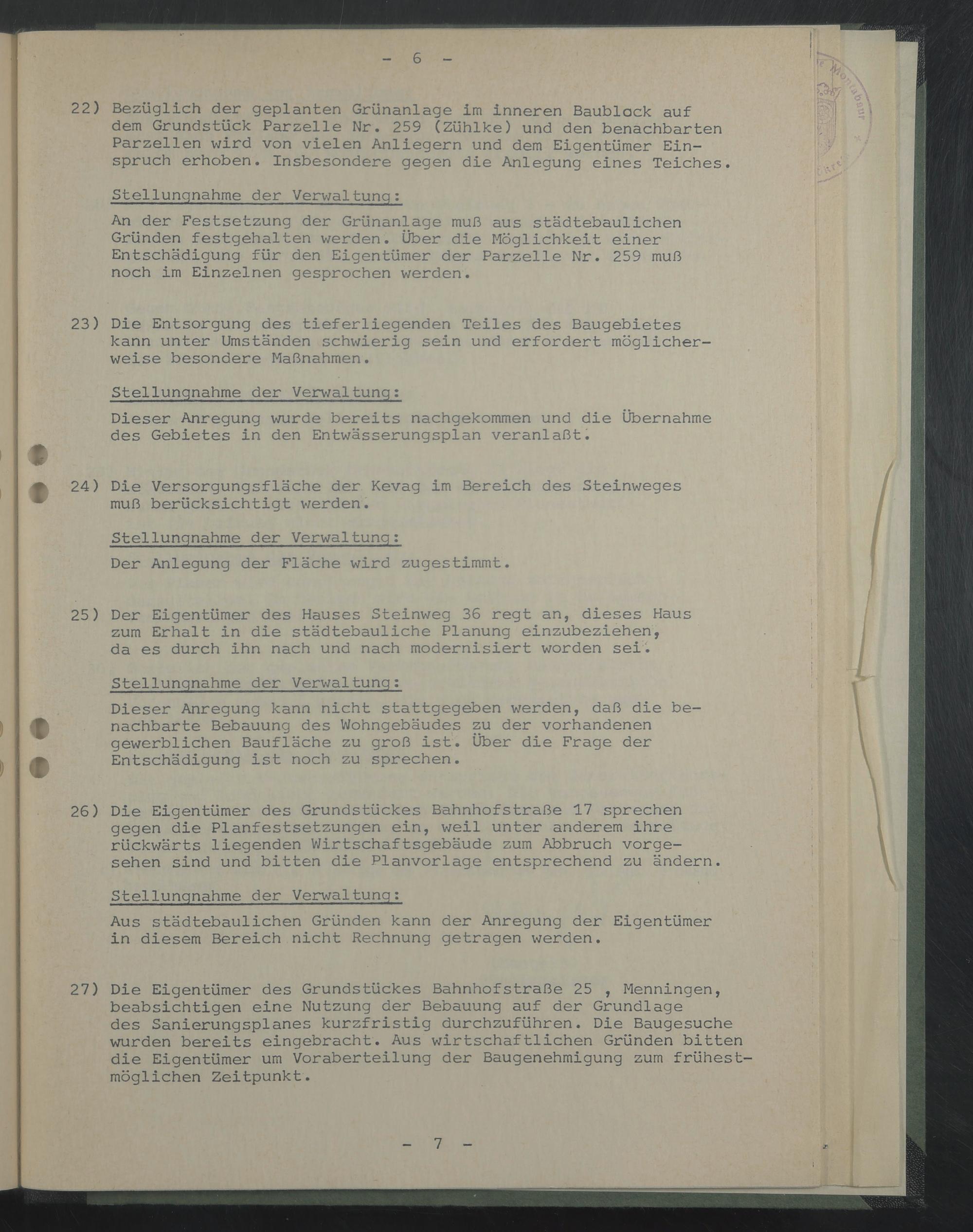An der Festsetzung der Grünanlage muß aus städtebaulichen Gründen festgehalten werden. Über die Möglichkeit einer Entschädigung für den Eigentümer der Parzelle Nr. 259 muß noch im Einzelnen gesprochen werden.