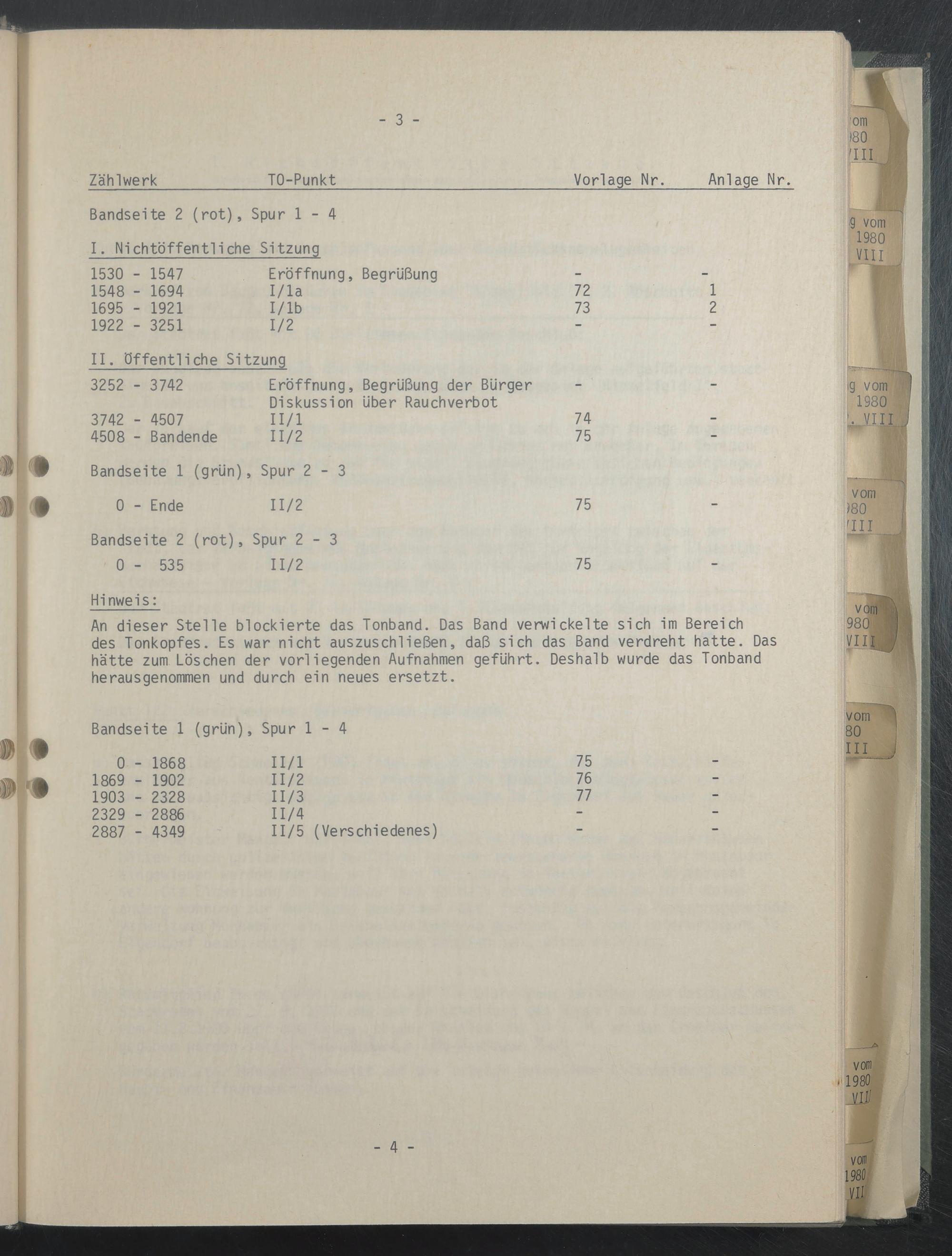 An dieser Stelle blockierte das Tonband. Das Band verwickelte sich im Bereich des Tonkopfes. Es war nicht auszuschließen, daß sich das Band verdreht hatte. Das hätte zum Löschen der vorliegenden Aufnahmen geführt. Deshalb wurde das Tonband herausgenommen und durch ein neues ersetzt.