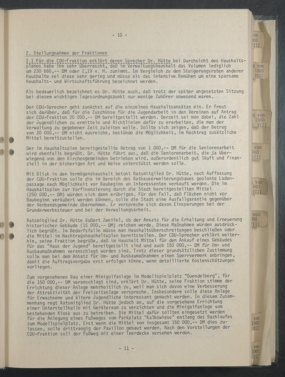 Ratsmitglied Dr. Hütte äußert Zweifel, ob der Ansatz für die Erhaltung und Erneuerung historischer Gebäude (15 000,-- DM) reichen werde. Diese Maßnahmen würden ausdrücklich begrüßt. Im Bedarfsfälle müsse man Haushaltsüberschreitungen beschließen oder die Mittel im Nachtragshaushaltsplan bereitstellen. Der CDU-Sprecher erklärt weiterhin, seine Fraktion begrüße, daß im Haushalt Mittel für den Ankauf eines Gebäudes für das "Haus der Jugend" bereitgestellt sind und auch 150 000,-- DM für Um- und Ausbaumaßnahmen veranschlagt worden sind. Trotz dieser grundsätzlichen Zustimmung solle man bei dem Ansatz für Um- und Ausbaumaßnahmen einen Sperrvermerk anbringen, damit die Auftragsvergabe erst erfolgen könne, wenn detaillierte Kostenschätzungen vorliegen.