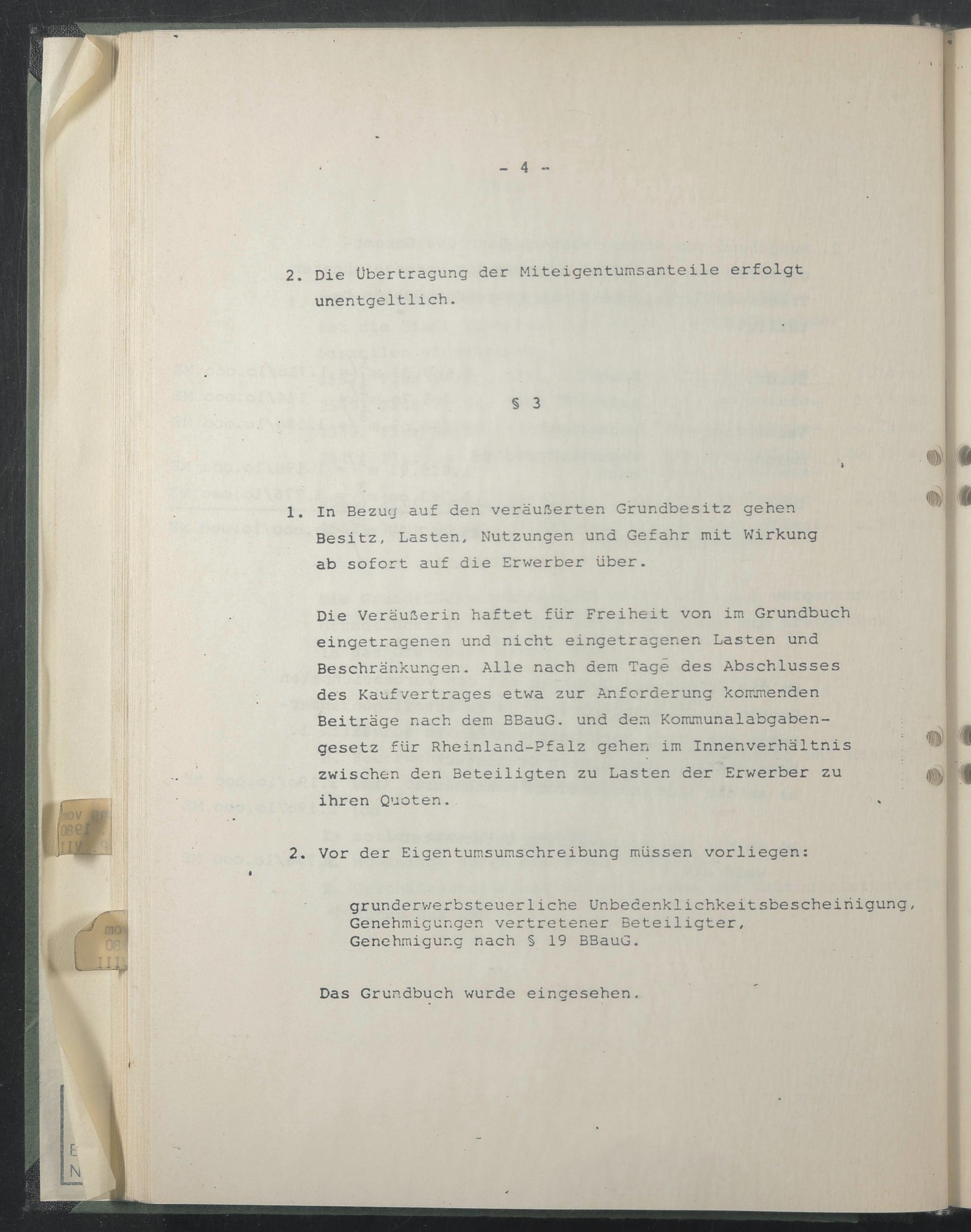 Die Veräußerin haftet für Freiheit von im Grundbuch eingetragenen und nicht eingetragenen Lasten und Beschränkungen. Alle nach dem Tage des Abschlusses des Kaufvertrages etwa zur Anforderung kommenden Beiträge nach dem BBauG, und dem Kommunalabgabengesetz für Rheinland-Pfalz gehen im Innenverhältnis zwischen den Beteiligten zu Lasten der Erwerber zu ihren Quoten.