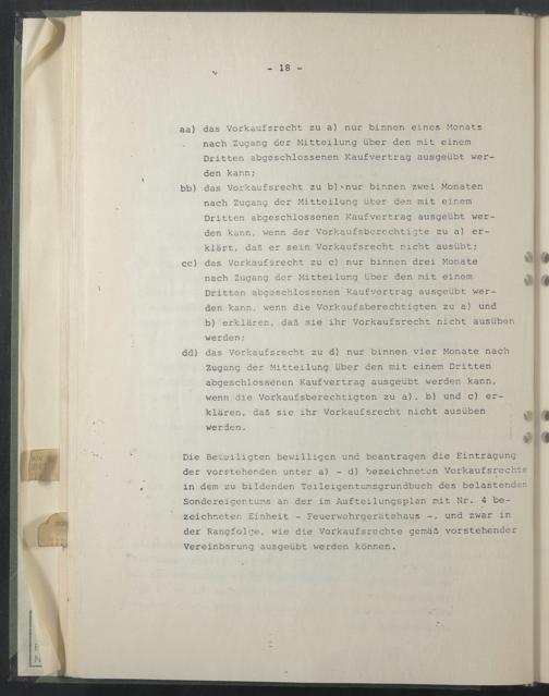 Die Beteiligten bewilligen und beantragen die Eintragung der vorstehenden unter a) - d) bezeichneten Vorkaufsrechte in dem zu bildenden Teileigentumsgrundbuch des belastenden Sondereigentums an der im Aufteilungsplan mit Nr. 4 bezeichneten Einheit - Feuerwehrgerätehaus -, und zwar in der Rangfolge, wie die Vorkaufsrechte gemäß vorstehender Vereinbarung ausgeübt werden können.
