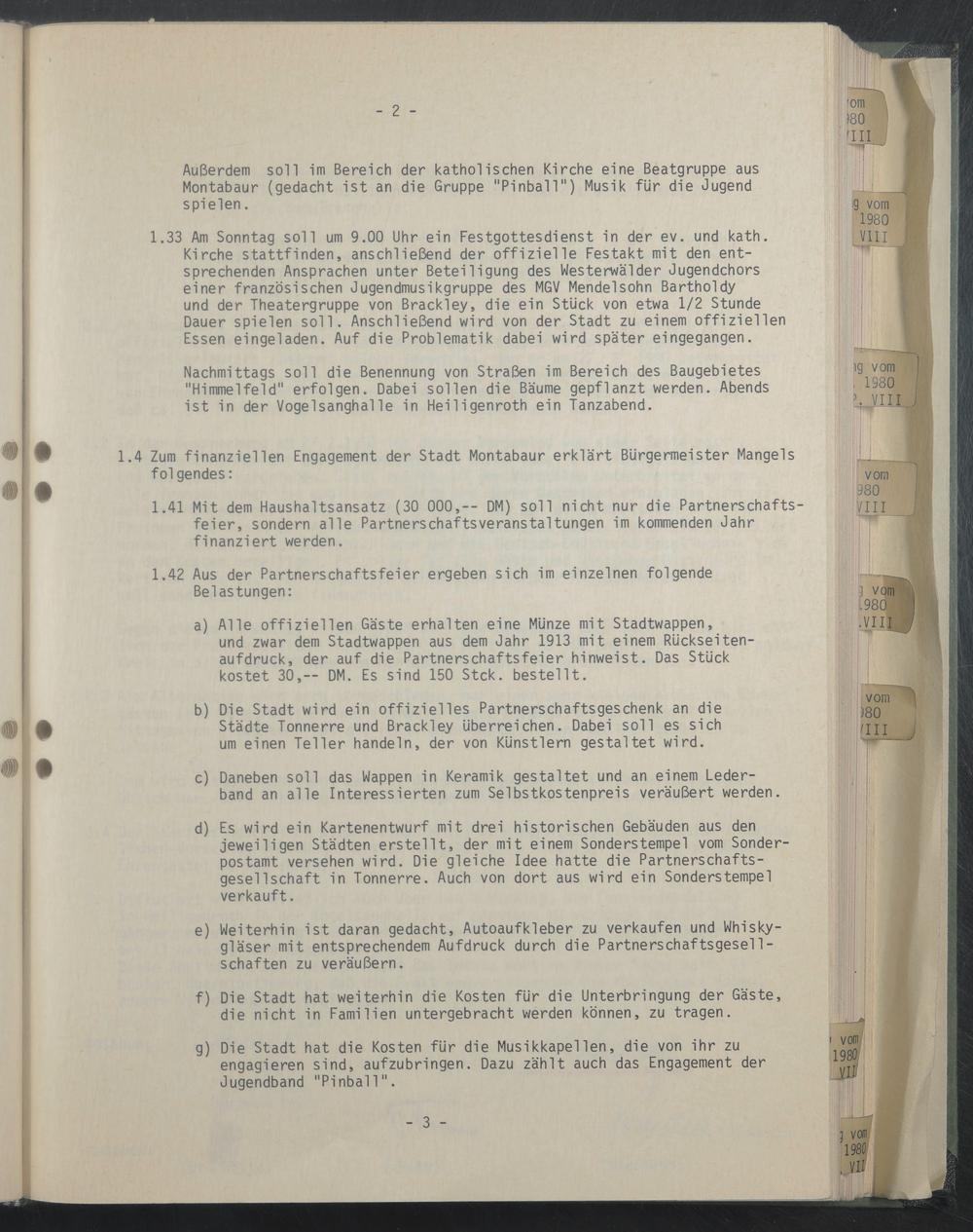 1.33 Am Sonntag soll um 9.00 Uhr ein Festgottesdienst in der ev. und kath. Kirche stattfinden, anschließend der offizielle Festakt mit den entsprechenden Ansprachen unter Beteiligung des Westerwälder Jugendchors einer französischen Jugendmusikgruppe des MGV Mendelsohn Bartholdy und der Theatergruppe von Brackley, die ein Stück von etwa 1/2 Stunde Dauer spielen soll. Anschließend wird von der Stadt zu einem offiziellen Essen eingeladen. Auf die Problematik dabei wird später eingegangen.