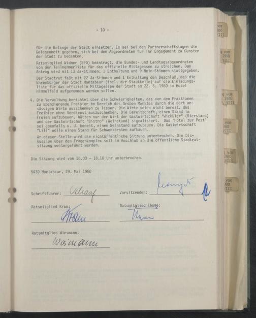 Der Stadtrat faßt mit 22 Ja-Stimmen und 1 Enthaltung den Beschluß, daß die Ehrenbürger der Stadt Montabaur (incl. der Stadtteile) auf die Einladungsliste für das offizielle Mittagessen der Stadt am 22. 6. 1980 im Hotel Himmelfeld aufgenommen werden sollen.